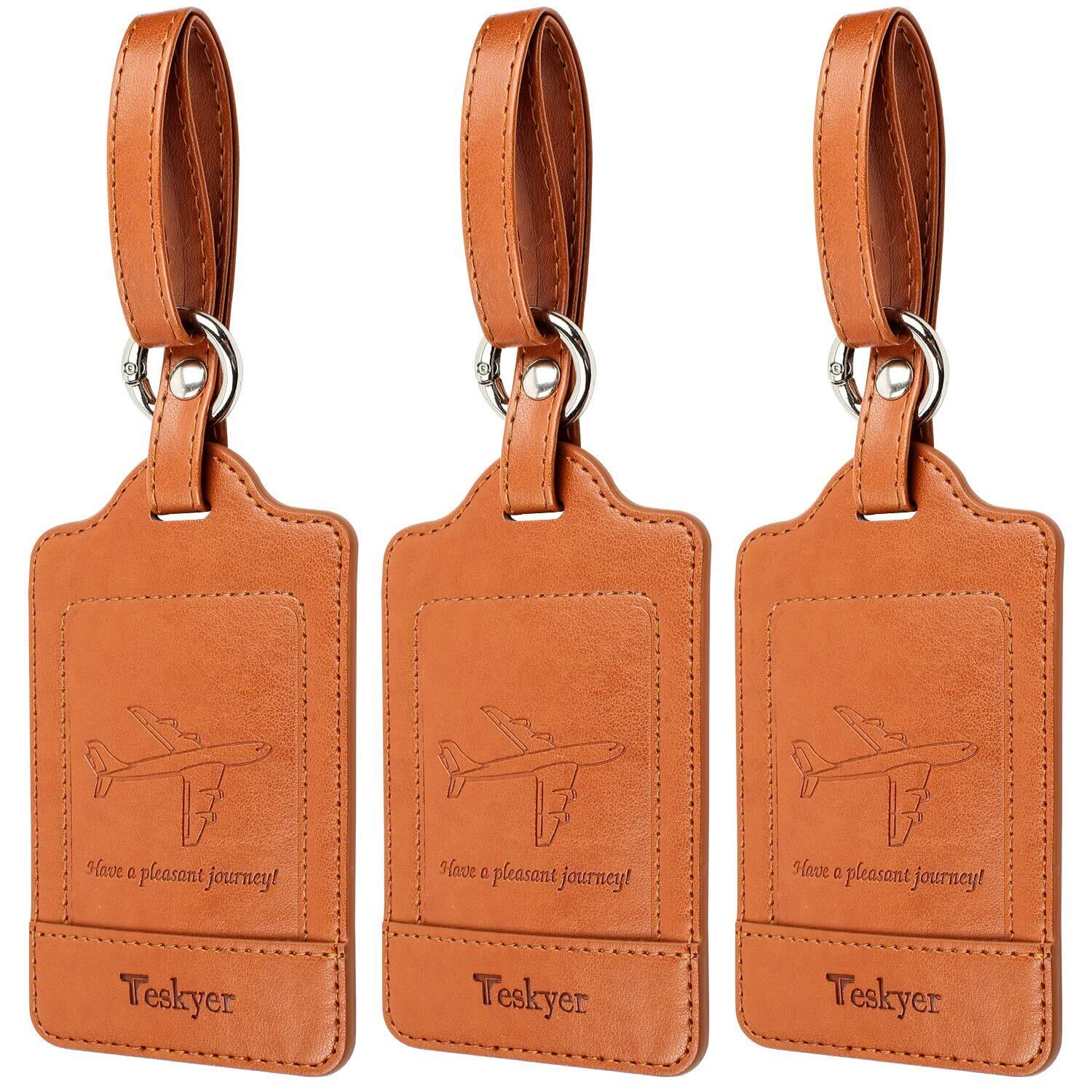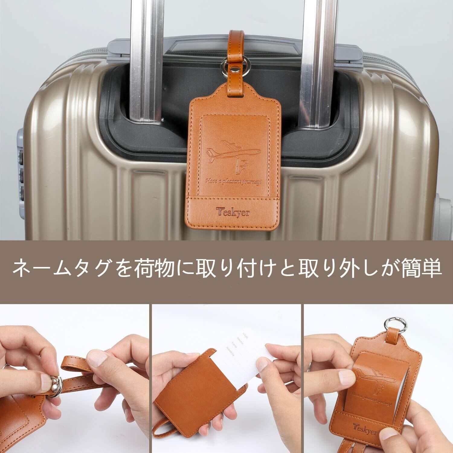 Teskyer 荷物タグ スーツケース 出張用タグ 番号札 バッグ用ネームタグ レザー トラベル用 旅行手荷物 ラベル 紛失防止 三枚入り(ブラウン)