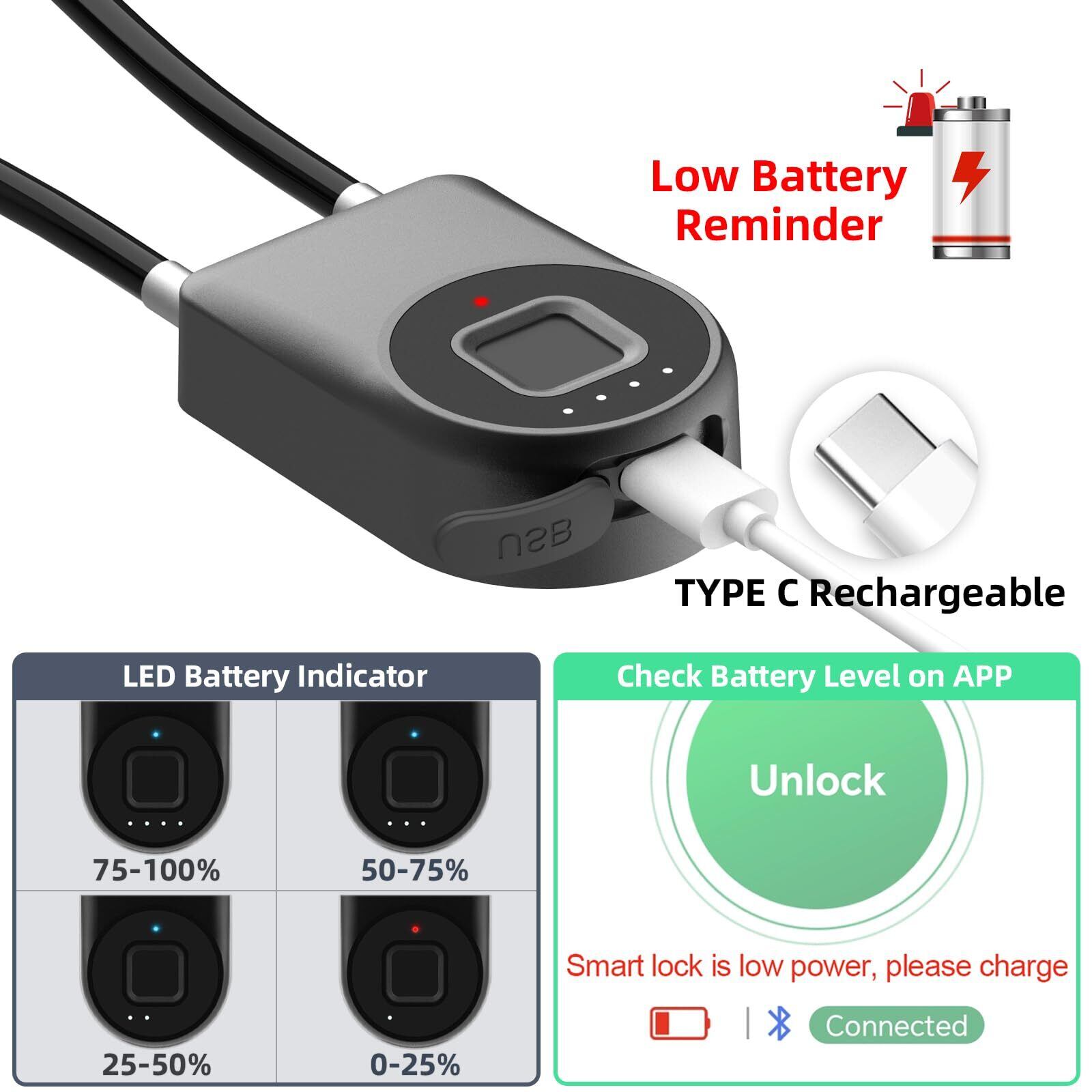【特価セール】南京錠 ワイヤーロック 22cm 指紋認証 APP解錠 ロッカーポスト 鍵 盗難防止 ケーブルロック 旅行用、荷物、スーツケース、バックパック、フェンス 屋外用 シルバー USB C 黑 [並行輸入品] | SmartLiving+