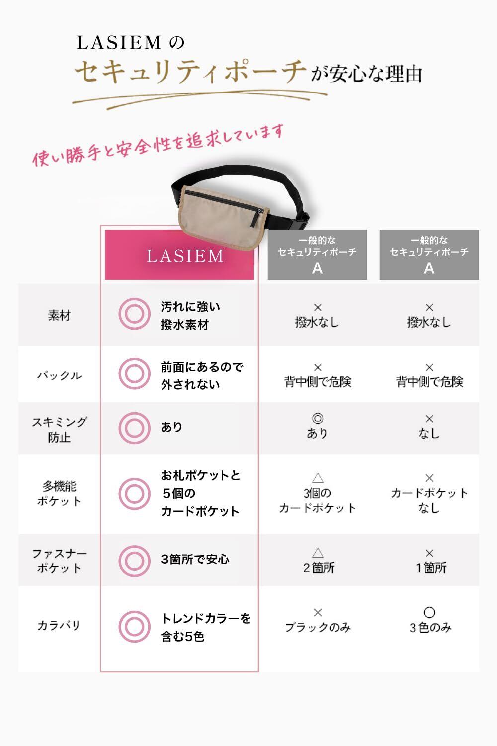 【セキュリティ対策を考え抜いたセキュリティポーチ】LASIEMオリジナル セキュリティポーチが誕生! (1)全面スキミング防止 (2)服に隠れる薄型設計 (3)カラビナ付き (4)側面バックル採用