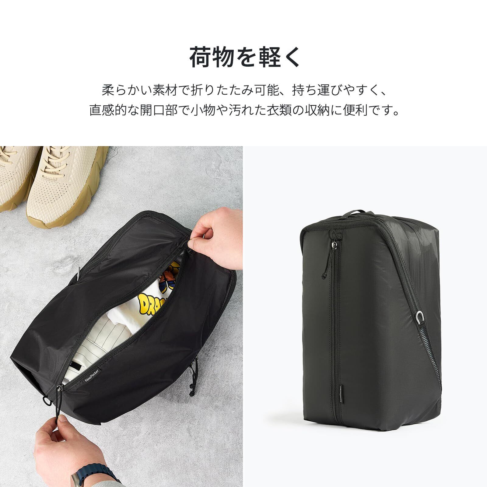 NextPacker 超軽量 シューズバッグ 2足の靴入れ袋 YKKジッパー 男女兼用 両面収納 防水 旅行ポーチ 大きめ アウトドア 登山 ハイキング 出張 旅行 便利グッズ(12L、ブラック)