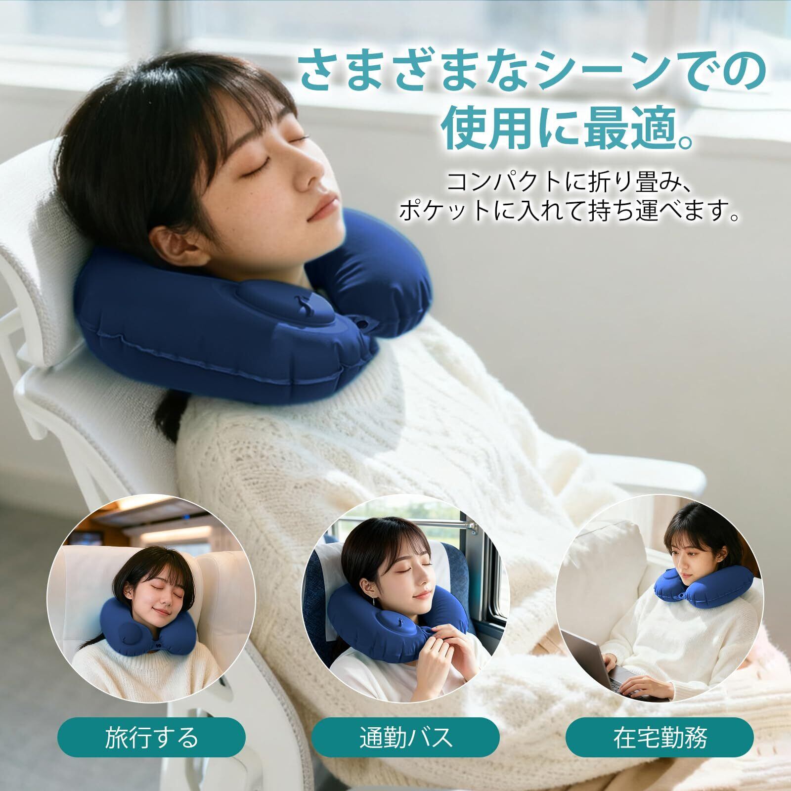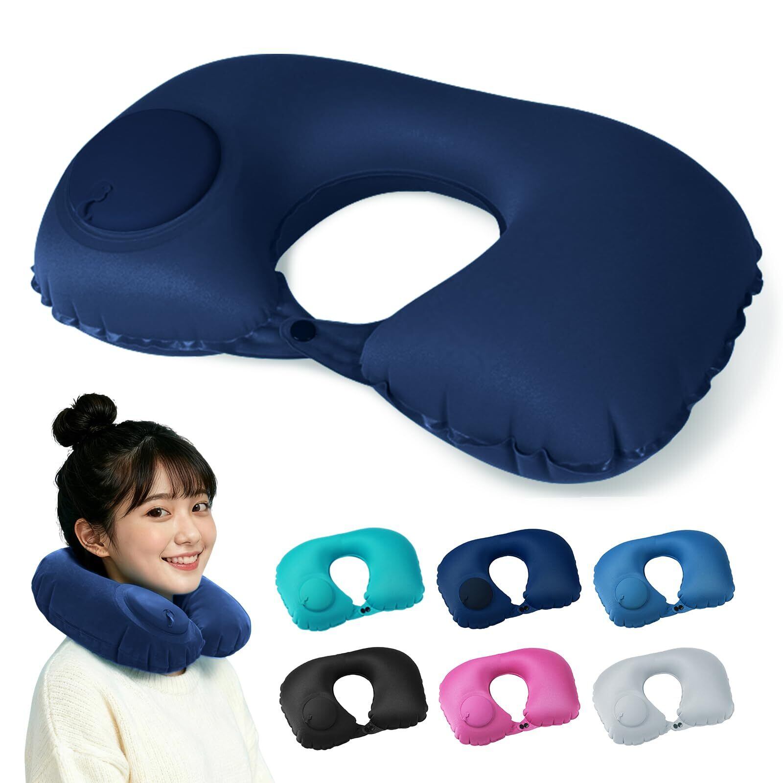 ネックピロー 首枕 携帯枕 空気枕 U型 エアーピロー 旅行用|ポンプ式 超軽量 コンパクト|飛行機 車 新幹線 バス オフィス 自宅|収納ポーチ付き(ダークブルー)