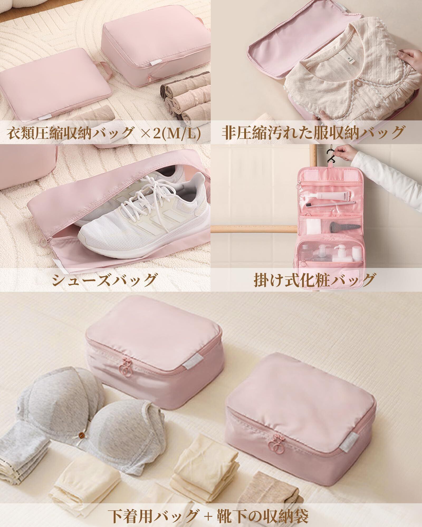 トラベルポーチ 圧縮 7点セット 旅行用ポーチ パッキングポーチ スペース40%節約 圧縮袋 旅行 圧縮バッグ スーツケース仕分け 軽量 丈夫なファスナー圧縮 出張 旅行 便利グッズ ピンク