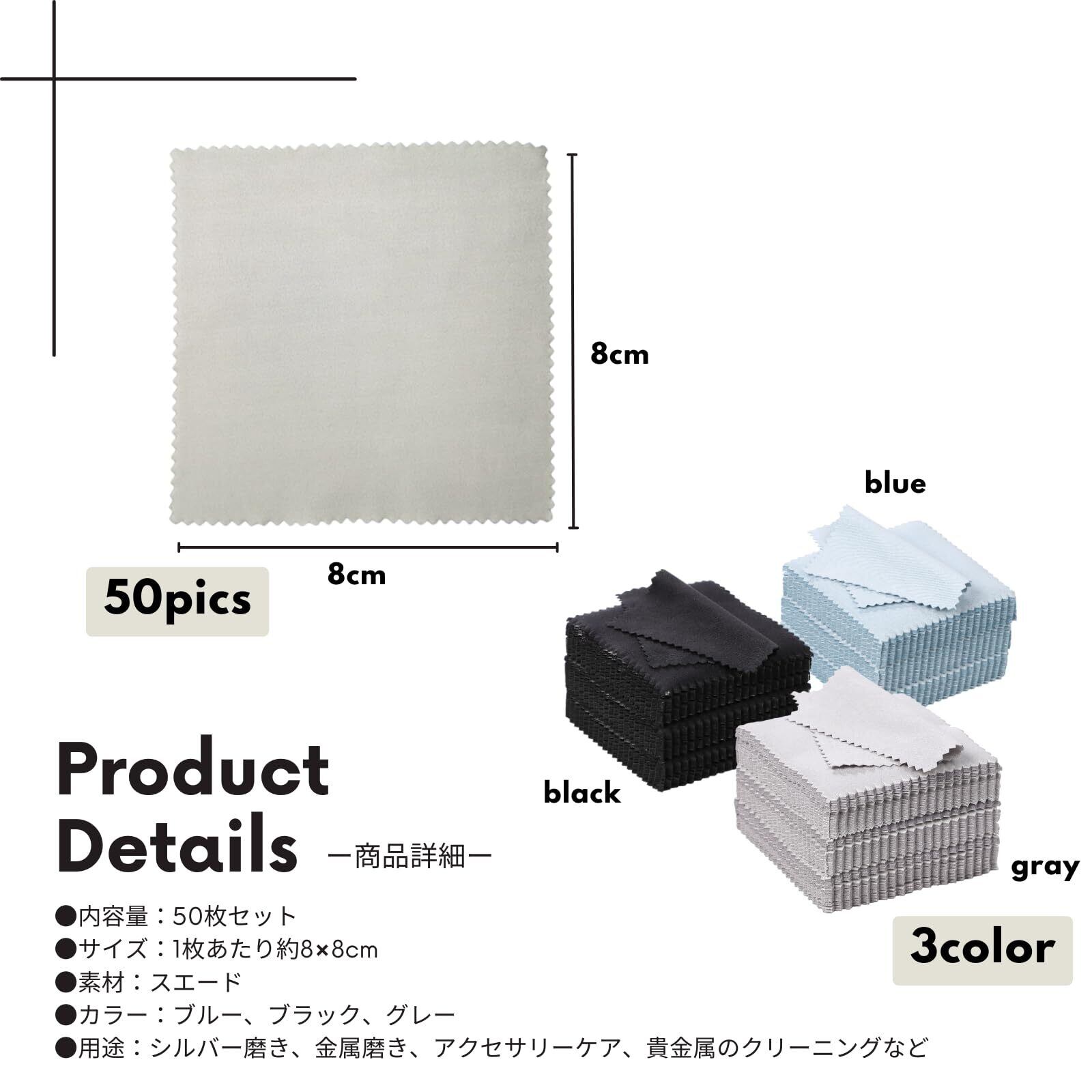 【商品詳細】 内容量:50枚セット サイズ:1枚あたり約8×8cm 素材:スエード カラー:ブルー、ブラック、グレー 用途:シルバー磨き、金属磨き、アクセサリーケア、貴金属のクリーニングなど