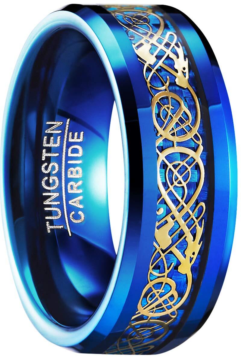 083基地 メンズ 指輪 リング タングステン ドラゴン 竜紋 カーボン 炭素繊維 横幅8mm 平打ち ブルー 真空メッキ 22号