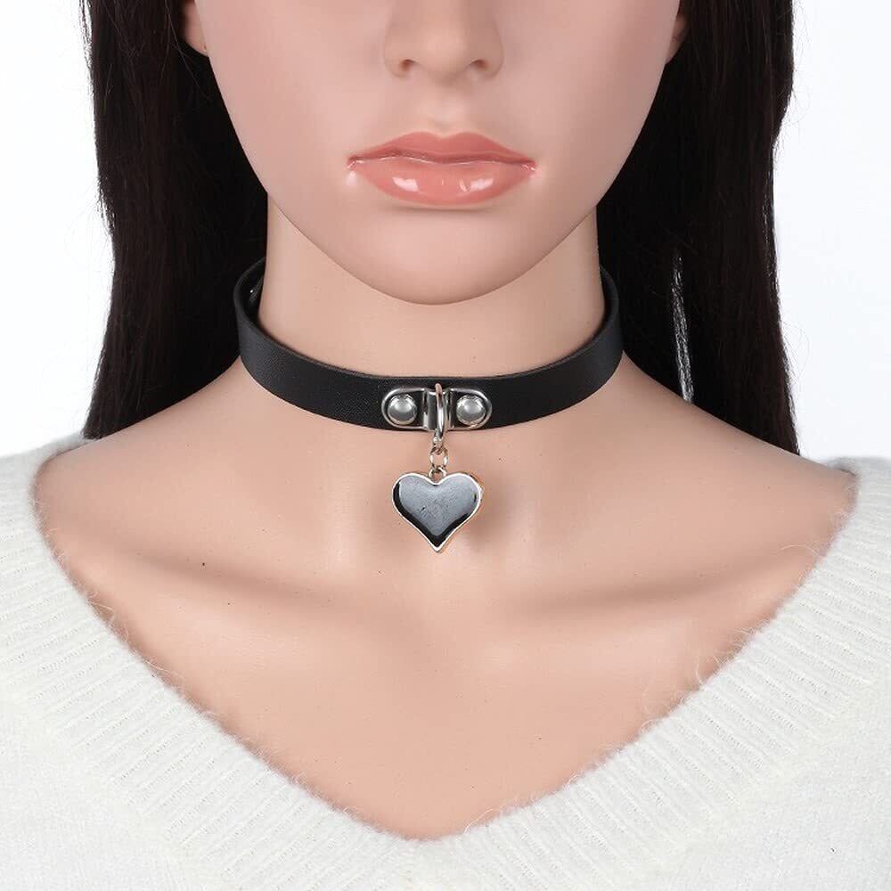 Deelfel 黒 チョーカー レディース レザー ブラック レッド ピンク 心ペンダントネックレス ハート チョーカー パンク ロック 首輪 ファッション アクセサリー (ブラック)