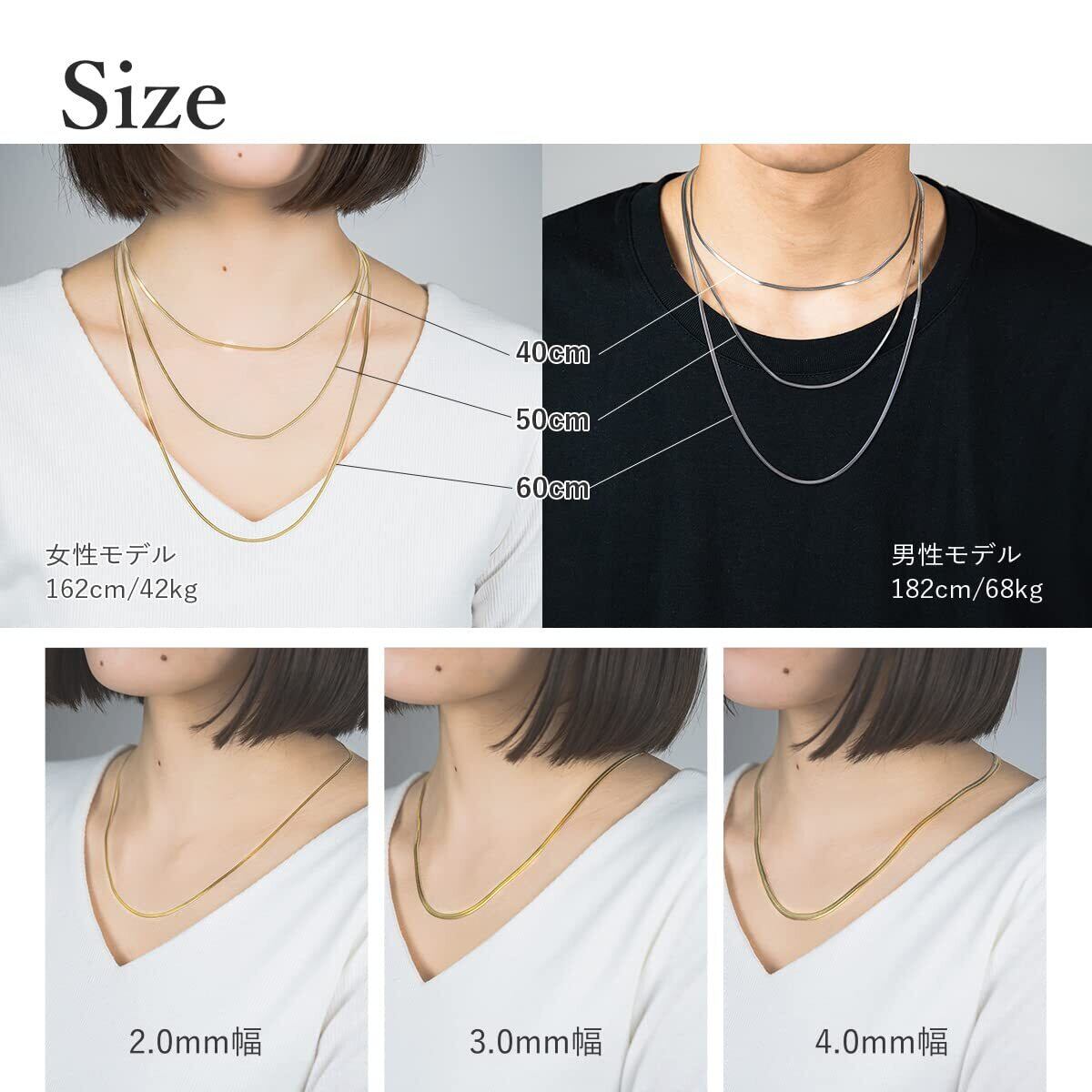 【バリエーション豊富】チェーン幅が2mm,3mm,4mmの3種類、チェーンの長さが40cm,50cm,60cm、カラーがシルバー、ゴールドの2色の計18種類からお選びいただけますので貴方のお気に入りがきっと見つかります。シンプルに着用したり、2,3本重ねて着けたりお手持ちのチャームなどと合わせてみたりとお好みのスタイルでお楽しみいただけます。