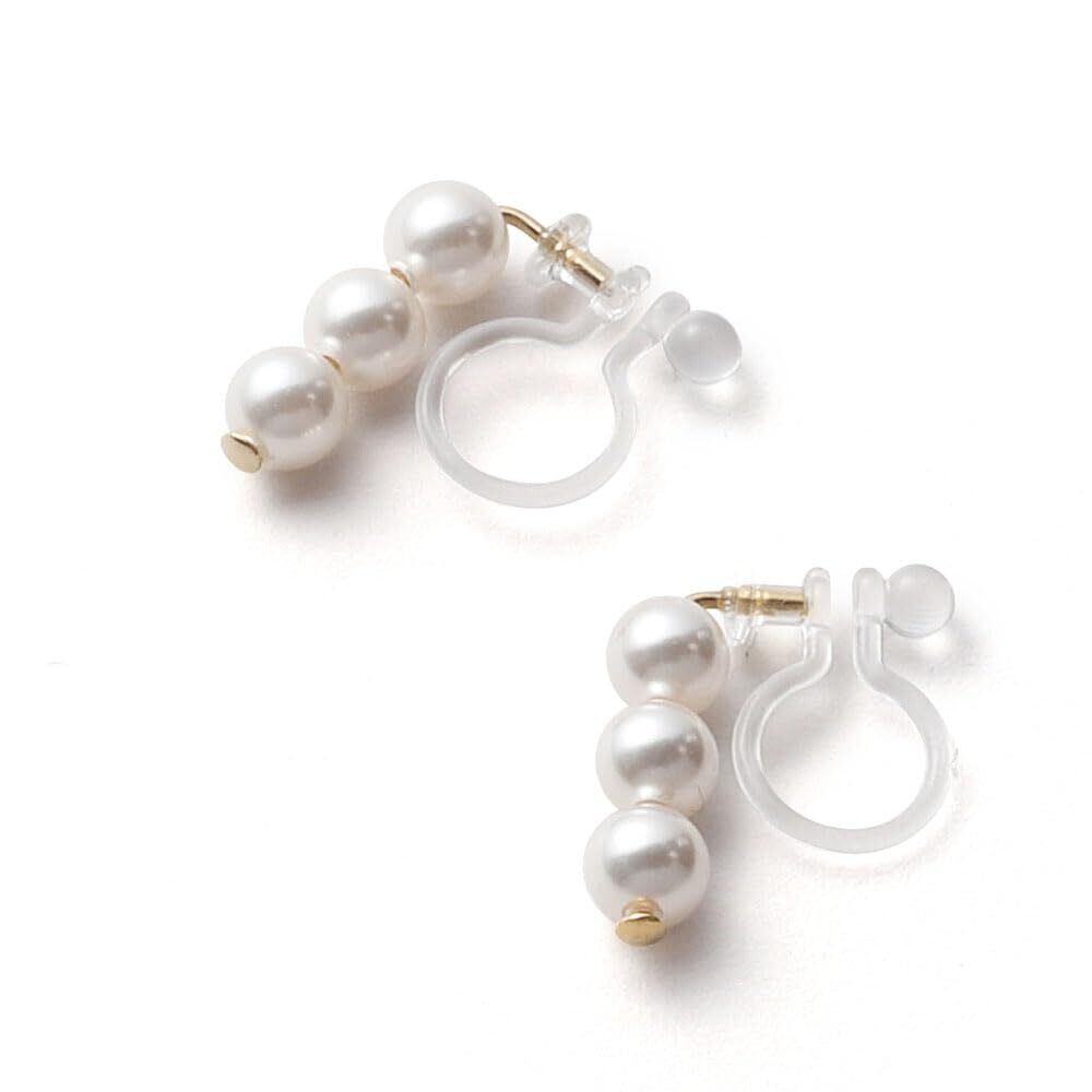 【女性らしさと品を高めてくれる真珠の輝き】一つあると色んなシーンに活躍する3連パールの樹脂イヤリング。本真珠のように輝くプレミアムなクリスタルパールです。