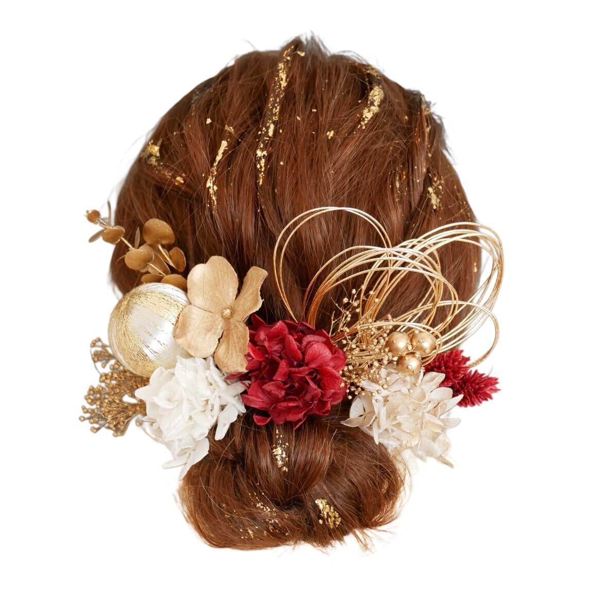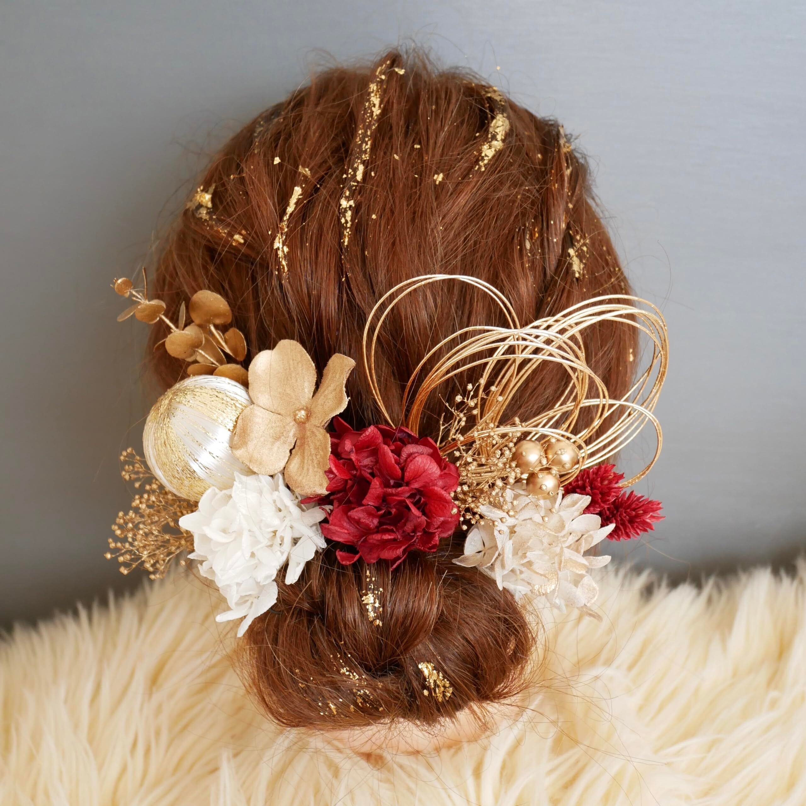 [Bria]成人式 卒業式 結婚式 七五三 和装 ドライフラワー プリザーブドフラワー髪飾り 金箔付き 和玉 (レッド)
