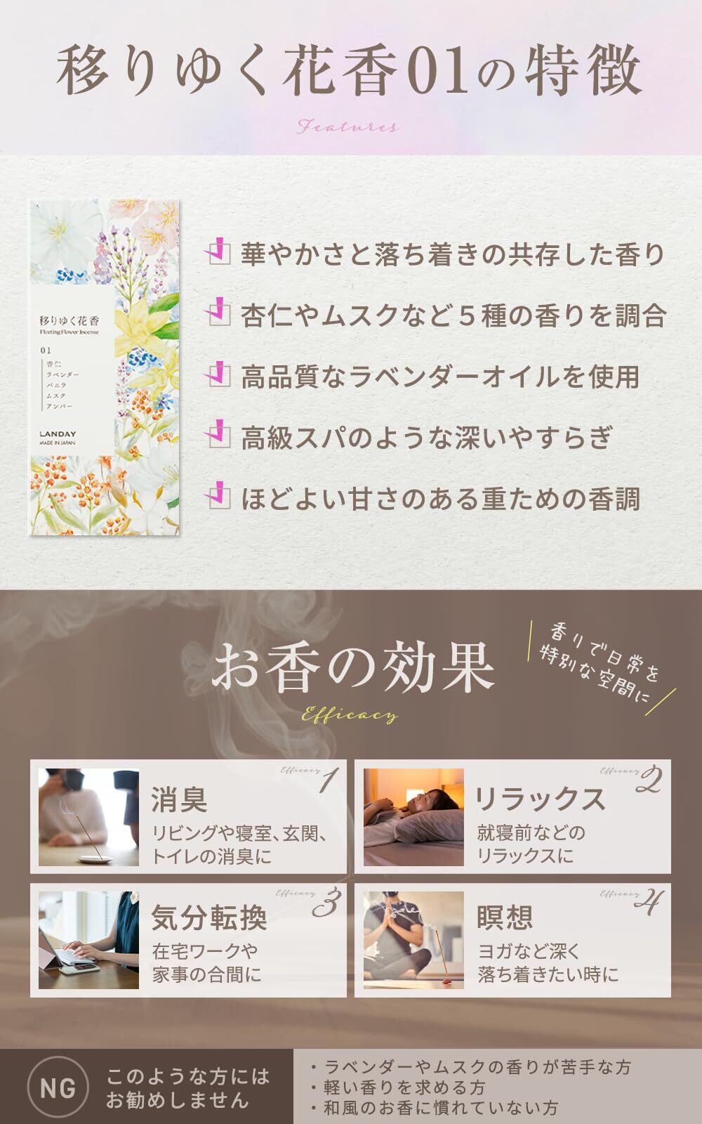 ■【華やかで気品ある香りをお楽しみ!】LANDAYの深くととのうお香は、穏やかな心をもたらす華やかで深い香りが特徴です✨ 日本製ならではの上質な和の香りが、お部屋の雰囲気を一新し、リラックスした時間を提供します。