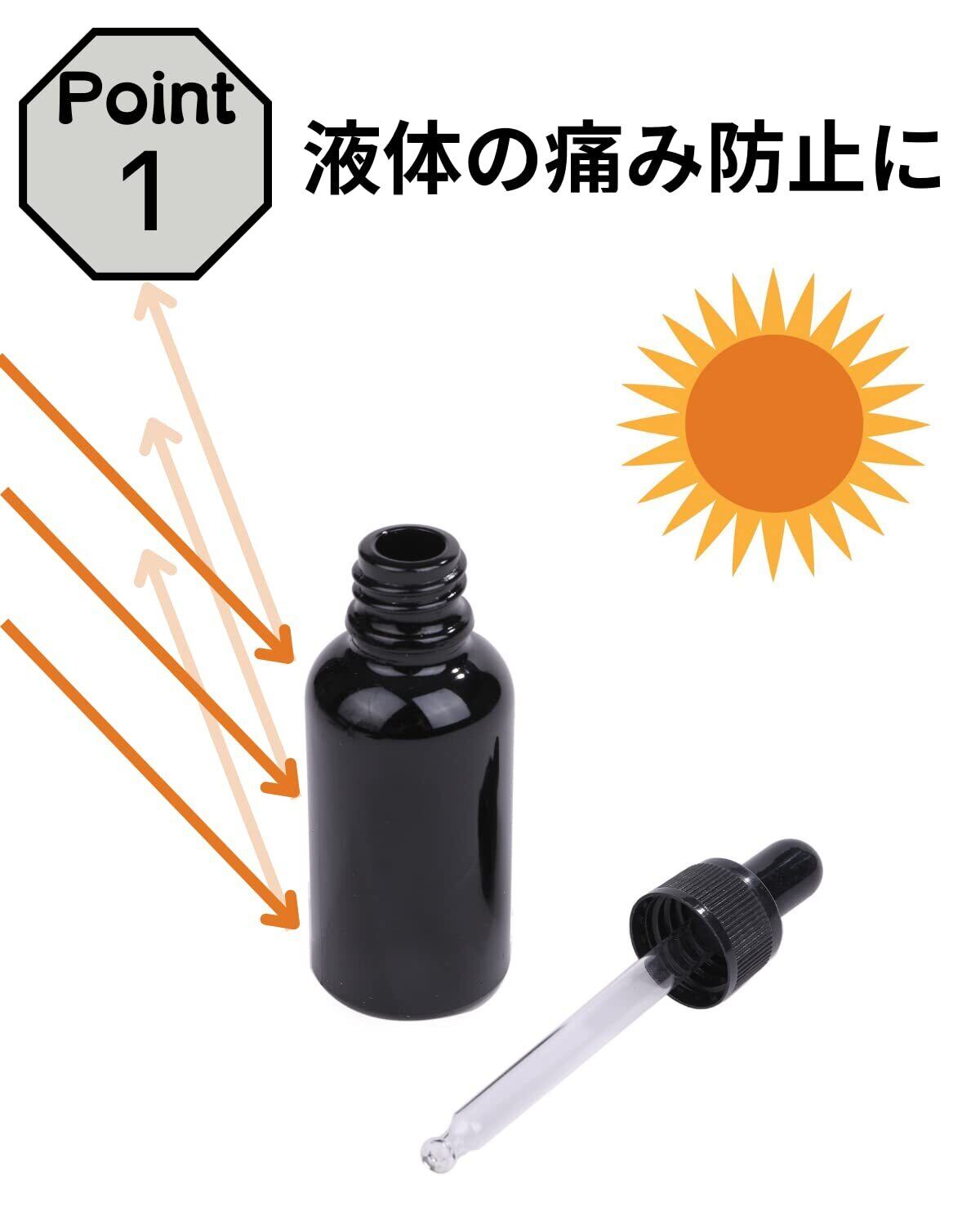 【ガラス製の遮光瓶で液体の痛み防止に】熱や紫外線から守るので中身の液体の痛みを防止します。 【スポイトで適量】シリコンゴムのつまみで適量を抽出できます。