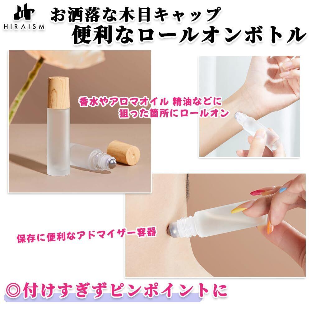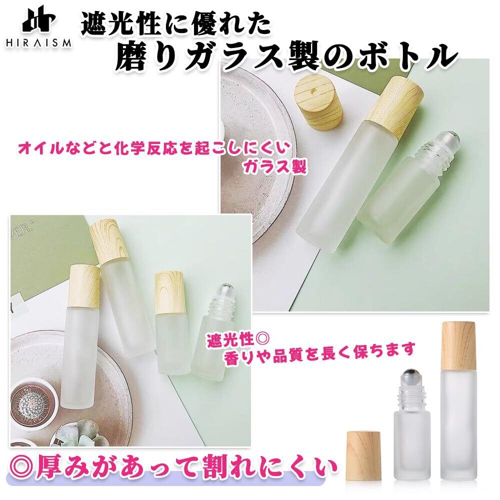 【新着商品】HIRAISM ロールオンボトル 遮光瓶 ミニボトル 容器 アロマ 精油 香水 おしゃれ すりガラス 木目キャップ 漏斗 スポイトセット付き (5ml 20本)