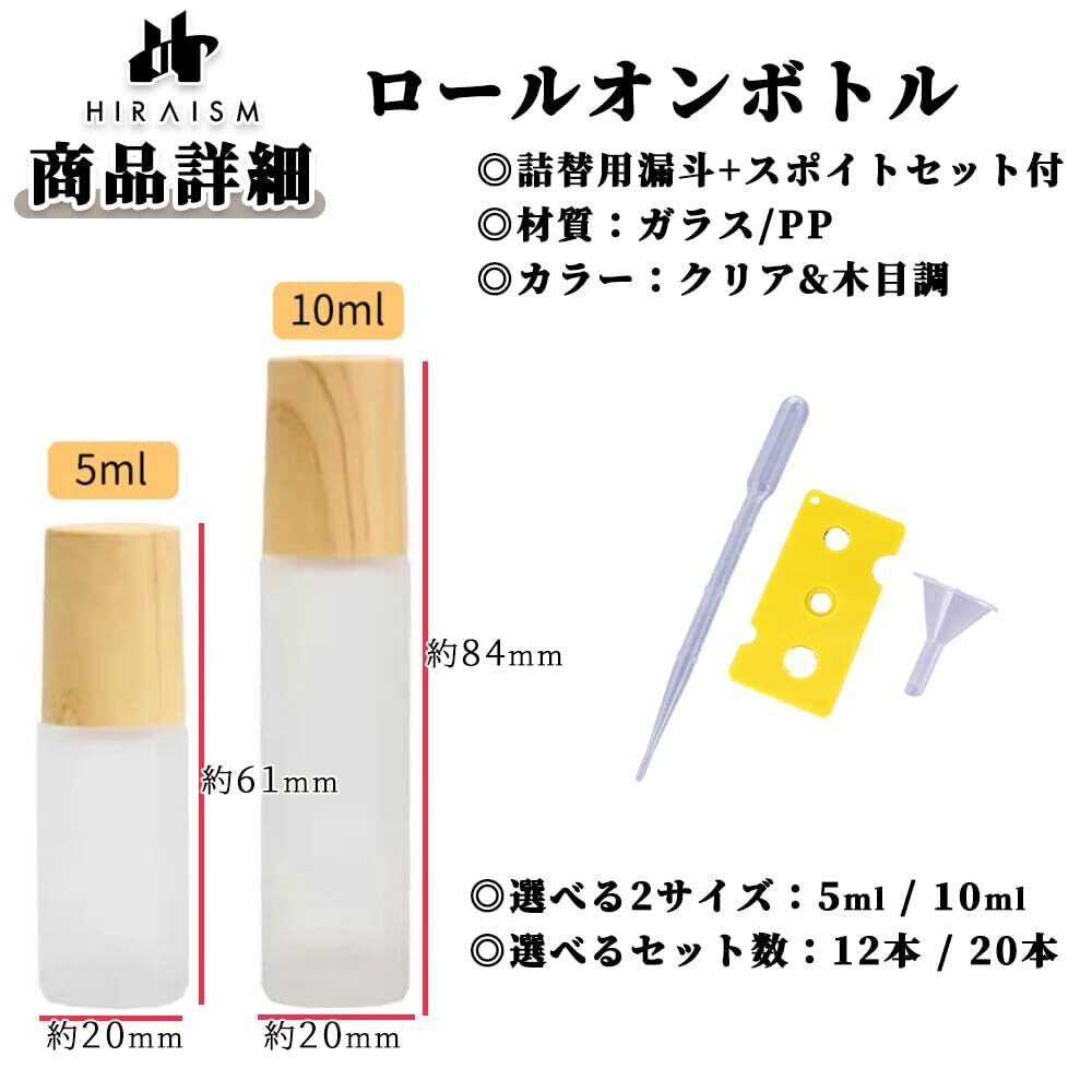 HIRAISM ロールオンボトル 遮光瓶 ミニボトル 容器 アロマ 精油 香水 おしゃれ すりガラス 木目キャップ 漏斗 スポイトセット付き (5ml 20本)