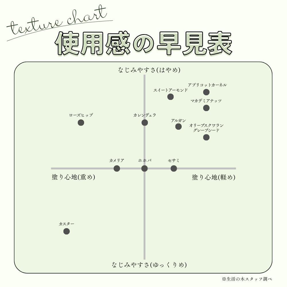 ●お肌に合わない場合は使用をお止めください。 ●刺激などの異常が現れた場合は使用を中止し、専門医に相談されることをおすすめいたします。 ●使用後はキャップをしっかりと閉めてください。 ●酸化した古いオイルは使用しないでください。 ●一度ボトルから出したオイルは元のボトルに戻さないでください。 ●種類によって低温で凝固することがありますが品質には問題ありません。室温(33℃程度)で液体状に戻ります。 ●高温多湿、直射日光のあたる場所、小さなお子さまやペットの手の届くところには保管しないでください。 ●生活の木の植物油は化粧品として取り扱っています。食品ではありません。 ●植物油を拭き取ったタオル類は、よく洗って出来るだけ油分を落とし、乾燥器は使用せず、風通しの良い所で乾かしてください。 ●天然成分のため、温度変化等により、若干の粘度変化、白濁やオリが生じることがありますが、品質には問題ありません。