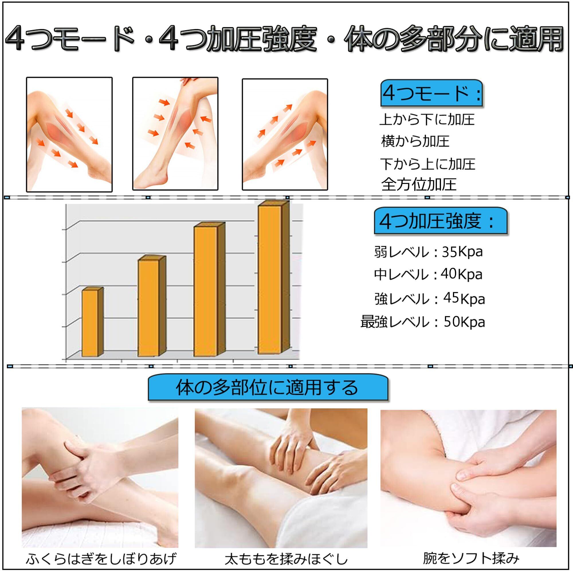 【4モード&4階段強度調整】ふくらはぎケアには4つのモードが付いています。モード1: 上から下に揉み、モード2:横から揉み、モード3:下から上に揉み、4:全方位揉み。また、弱・中・強の4段階の強さをを調節できるので、弱35kpa、中40kpa、強45kpa、最強50kpaお好みの最適な圧力を選んでください。