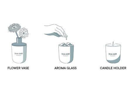 <おすすめの使用方法> フラワーベースとしてもご活用いただけます。 容器本体に入れたコットンやストーンにアロマオイルを数滴落として、アロマグラスとしてご使用いただけます。 キャンドルホルダーとしてキャンドルをお楽しみいただくことも可能です。 ※容器本体に直接火が当たらないようご注意ください。