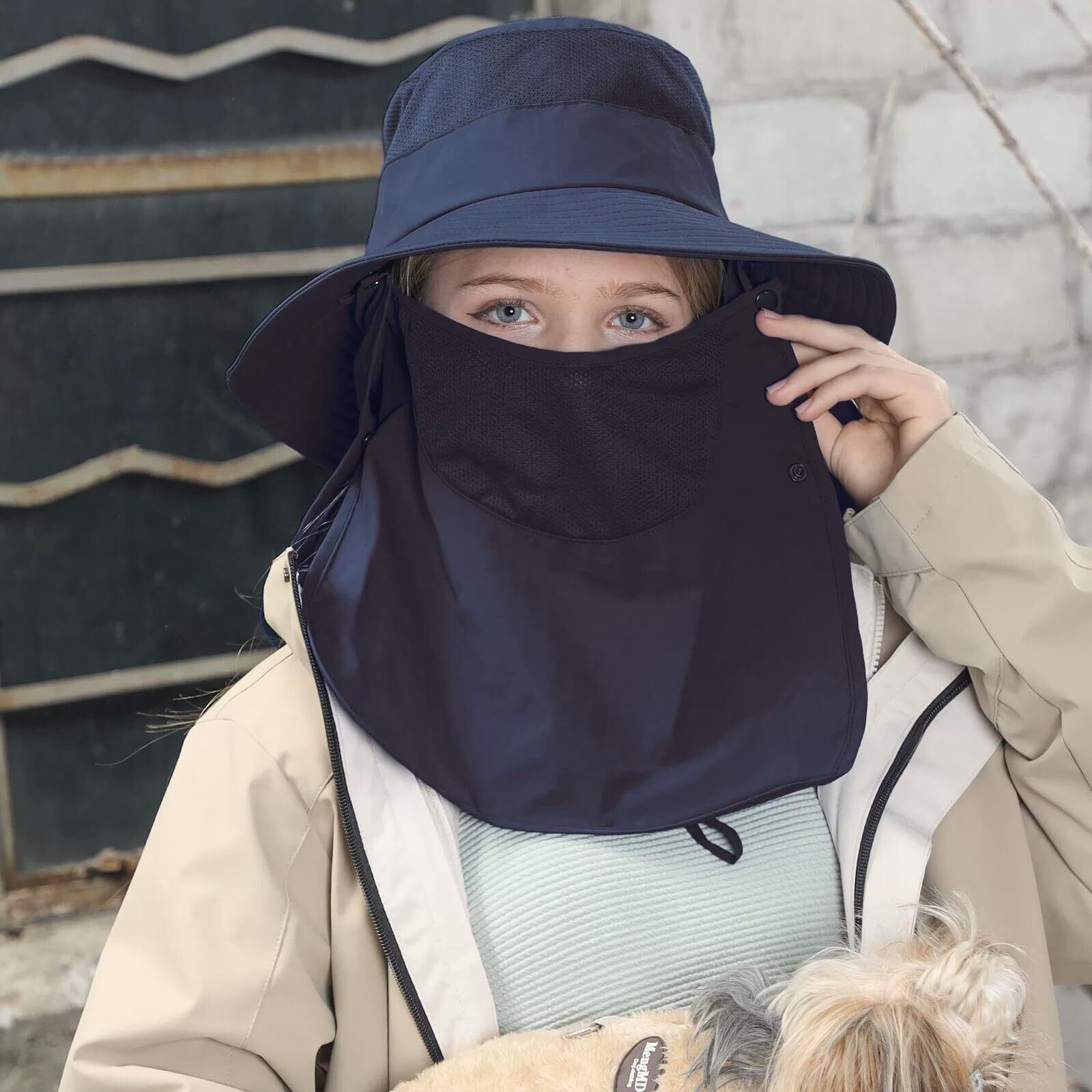 ■【機能的でスタイリッシュなデザイン!】つば広のデザインが、しっかりと顔をガードしつつ、小顔効果も演出します。首ガードと取り外し可能なフェイスカバーが付属しており、必要に応じてカスタマイズが可能です。ガーデニングや釣りだけでなく、日常のおしゃれにもぴったりです。