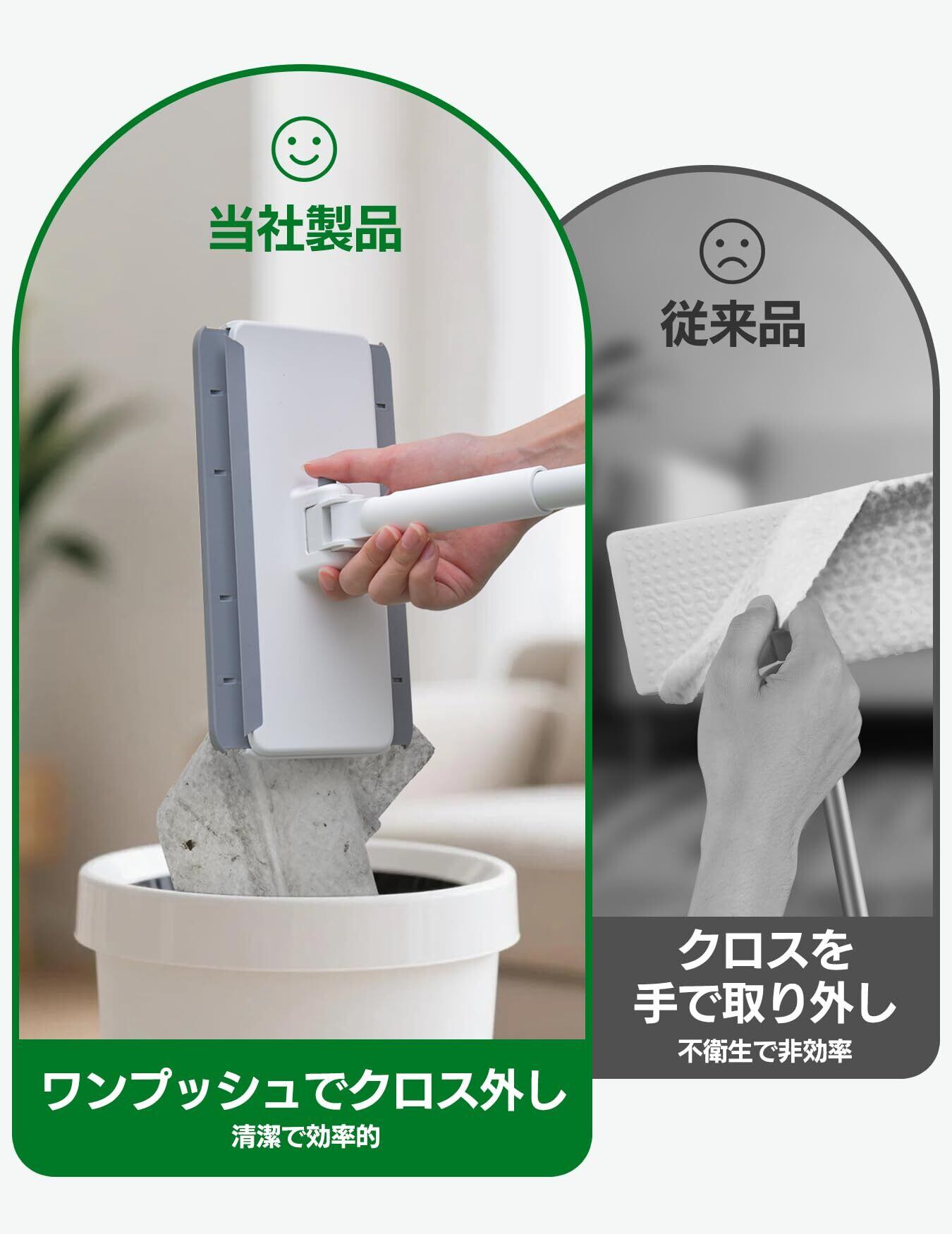 1秒でモップパッドを取り付け、しっかり固定:緩んだり滑ったりするモップパッドとはお別れしましょう。改良されたサメの歯のようなクリップ設計により、パッドは押すだけで所定の位置に固定されます。一般的なフローリングワイパーでは得られない安定性を実現します