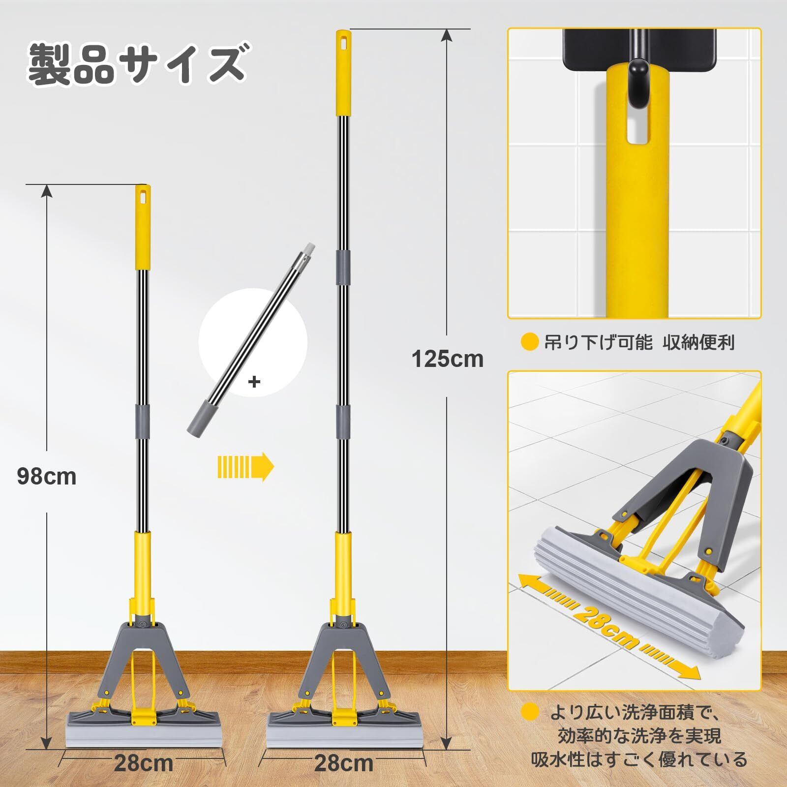 【清潔力強く 手が汚れない】スポンジモップは、普通のモップより吸塵力が優れていて、家事の効率がUPする。本体サイズ:幅28cmx長さ98~125cm。