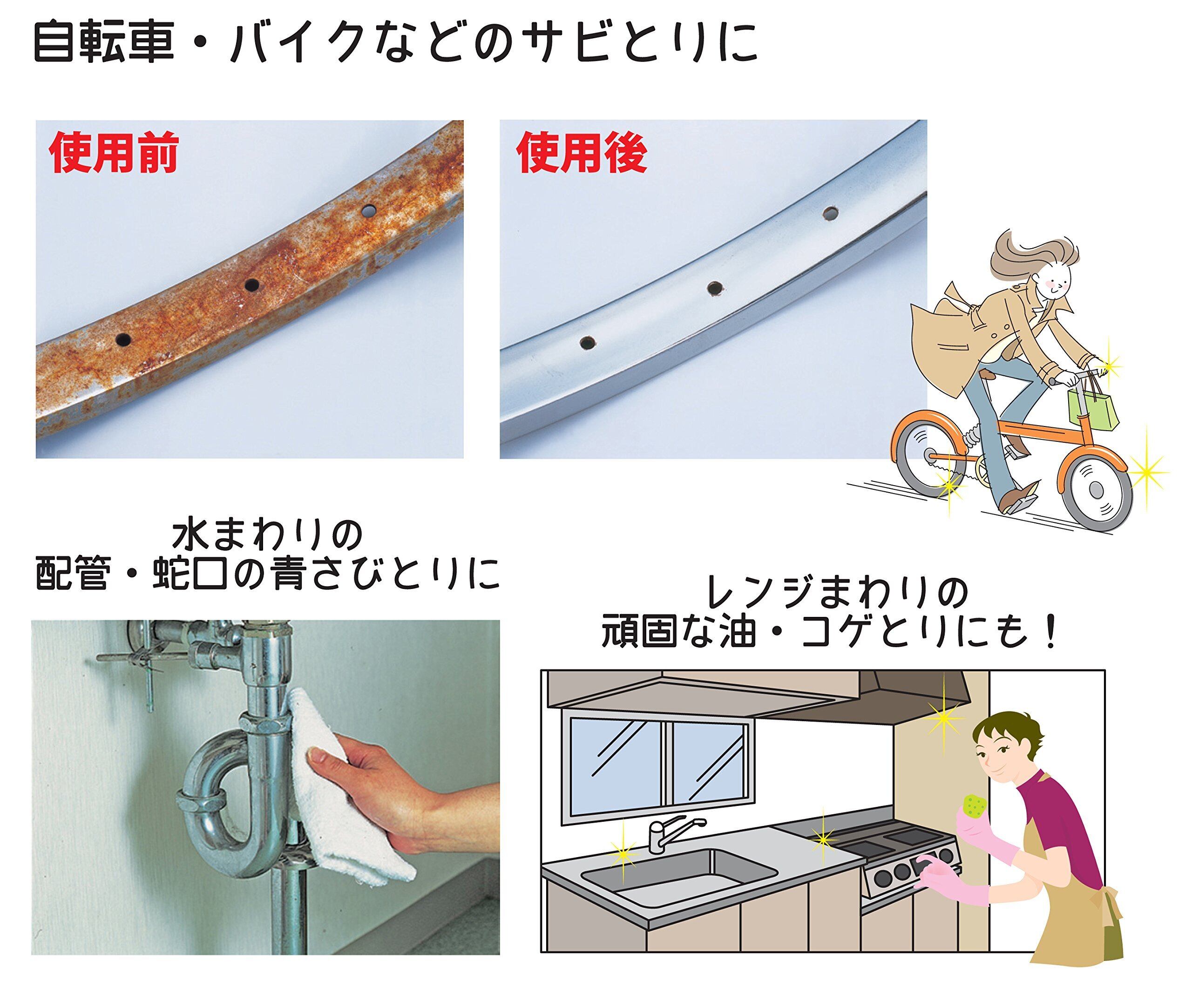 あらゆるサビにこれ1本! 発売から20年間売れ続けているロングセラー商品です。 キッチンやリビングの金属製品だけでなくあらゆるサビやオイル汚れなどガンコな汚れに。 手荒れやかぶれの心配もなく安心してお使いいただけます。 ホーロー製品、流し台シンクなどの作業の場合は強く擦るとキズをつけてる恐れがありますので、優しくお使いください。