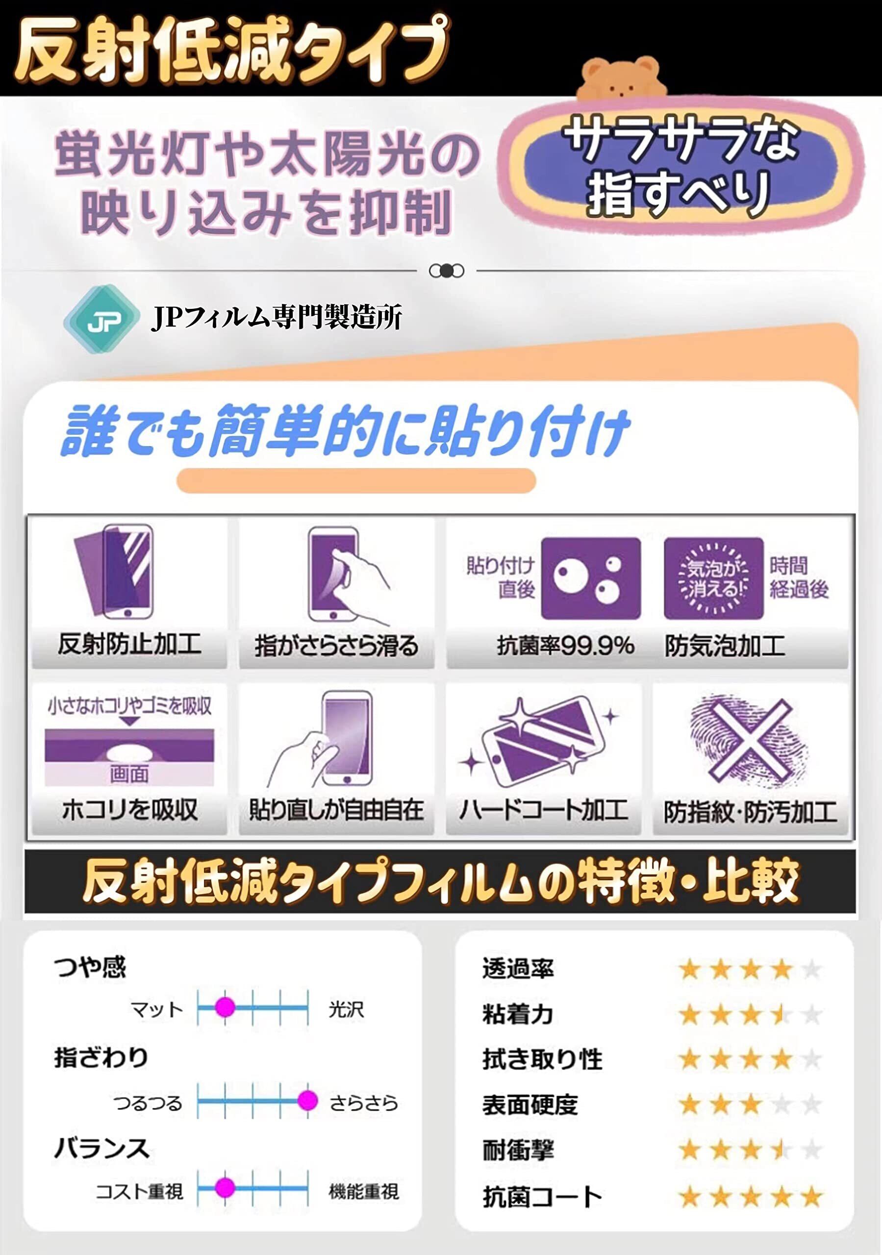 最新素材を採用しや表面特殊加工によりペン先の磨耗を80%低減させるため、タッチペンを長く使用できます。※鉛筆硬度3Hのハードコート加工により、フィルム表面の傷にも防止します。【抗菌機能】抗菌加工により、フィルム表面での雑菌の増殖を99.9%を抑えることができます。 清潔な状態を維持し、いつでもご安心してお使いいただけます。