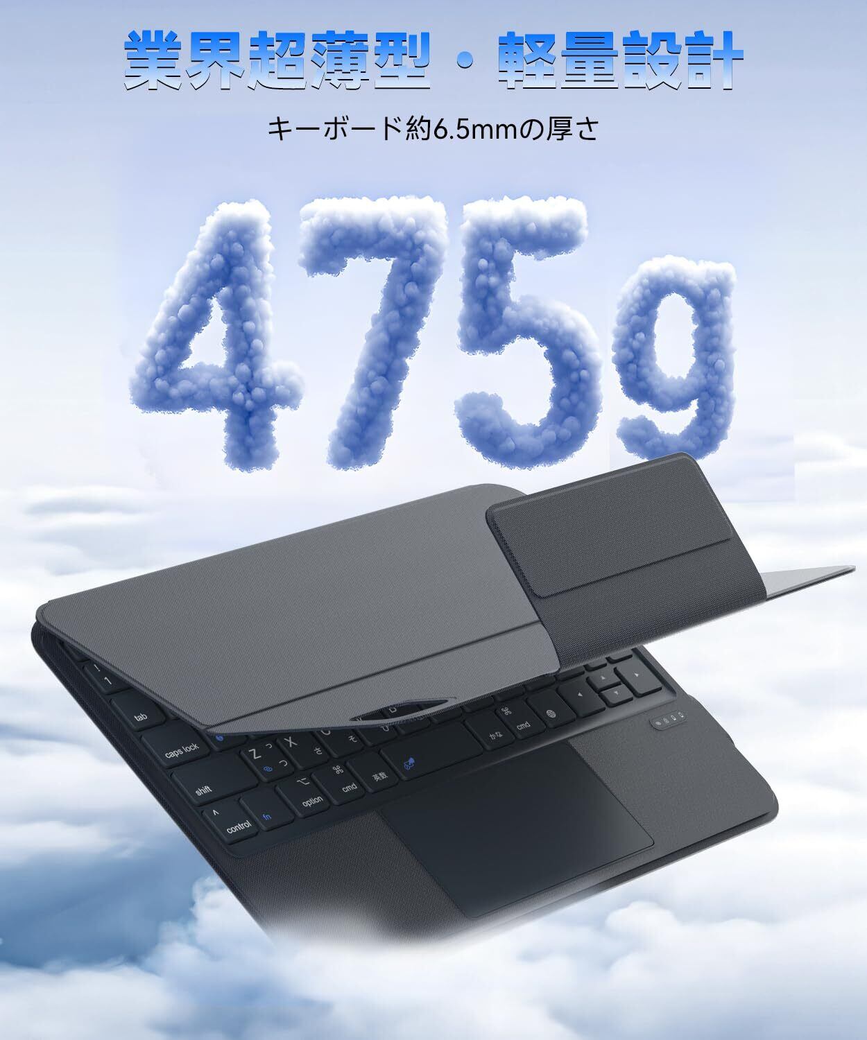 【軽量JIS日本語配列キーボード】ipad air キーボード 11インチ は全体約470gの重さ、スリムで軽量なデザインで、通勤の地下鉄や旅行はもちろん、お子様の勉強時にも最適。更に、日本人の方が使い勝手を考えたJIS 日本語配列を採用し、逆L型大型Enterキー、かなと英数キー、左右shiftキー、左右cmdキーを搭載し、ノートPCのように快適なタイピングが実現できるipad air 11インチ ケース キーボードです。
