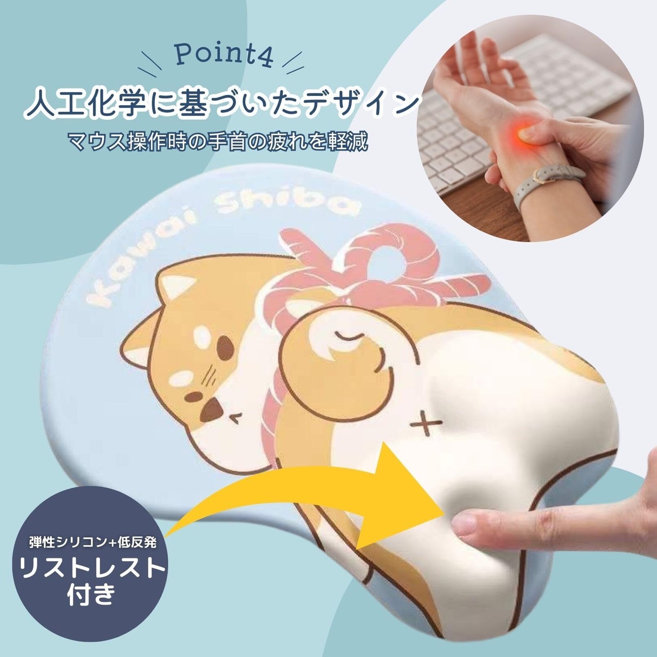 人間工学に基づいた設計の柴犬デザインマウスパッド。手首部分に低反発・弾性シリコン素材を使用し、衝撃を吸収して疲れを軽減。可愛い柴犬デザインで癒されながら快適に作業ができます。