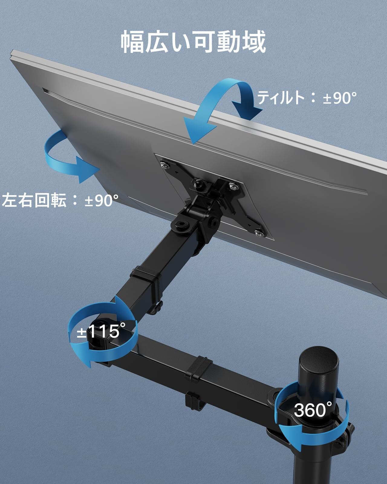 【角度・向きが自由に】前後調整、画面の角度調整が可能で、上下に約90°、左右に約180°調整できます。画面は左右に90°(合計180°)回転できます。第二関節は360°回転が可能で、第一関節部は115°調整が可能です。また、アームは前後移動できるので、手前に引き出して見やすく、壁に寄せてデスクを広く使えます。デスクの奥行きや環境に応じてベストな形に調整できます。