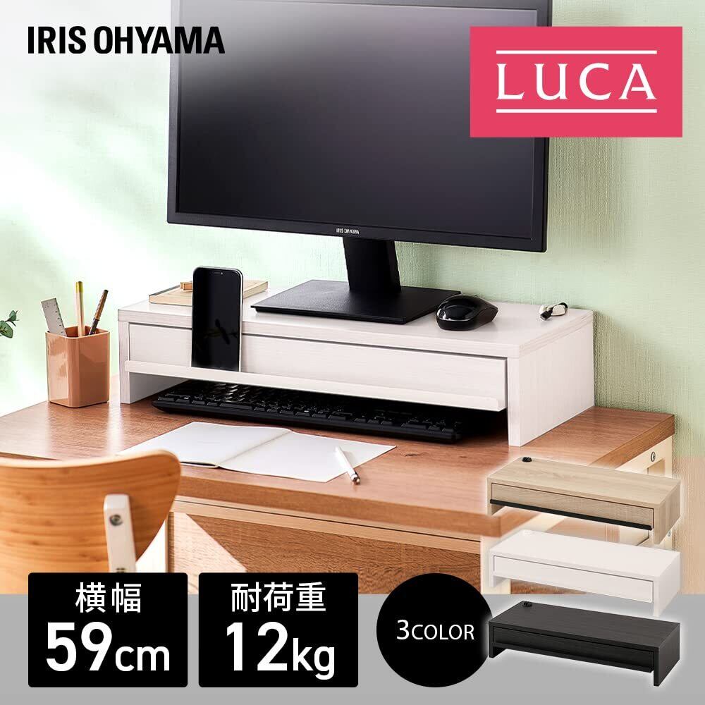 【特価商品】アイリスオーヤマ デスクがスッキリするモニター台 幅59cm 引出し付き ブラック 収納領域の大きなワイド設計 目線が上がるので首肩の負担が軽減 インテリアになじむシンプルデザイン ほこりが溜まりにくいフラット設計 モニター台 パソコン台 ディスプレイ台 机上台 PC台 プリンタ台 キーボード マウス収納 幅約59×奥行約26.4×高さ約13cm MNS-590H | SmartLiving+