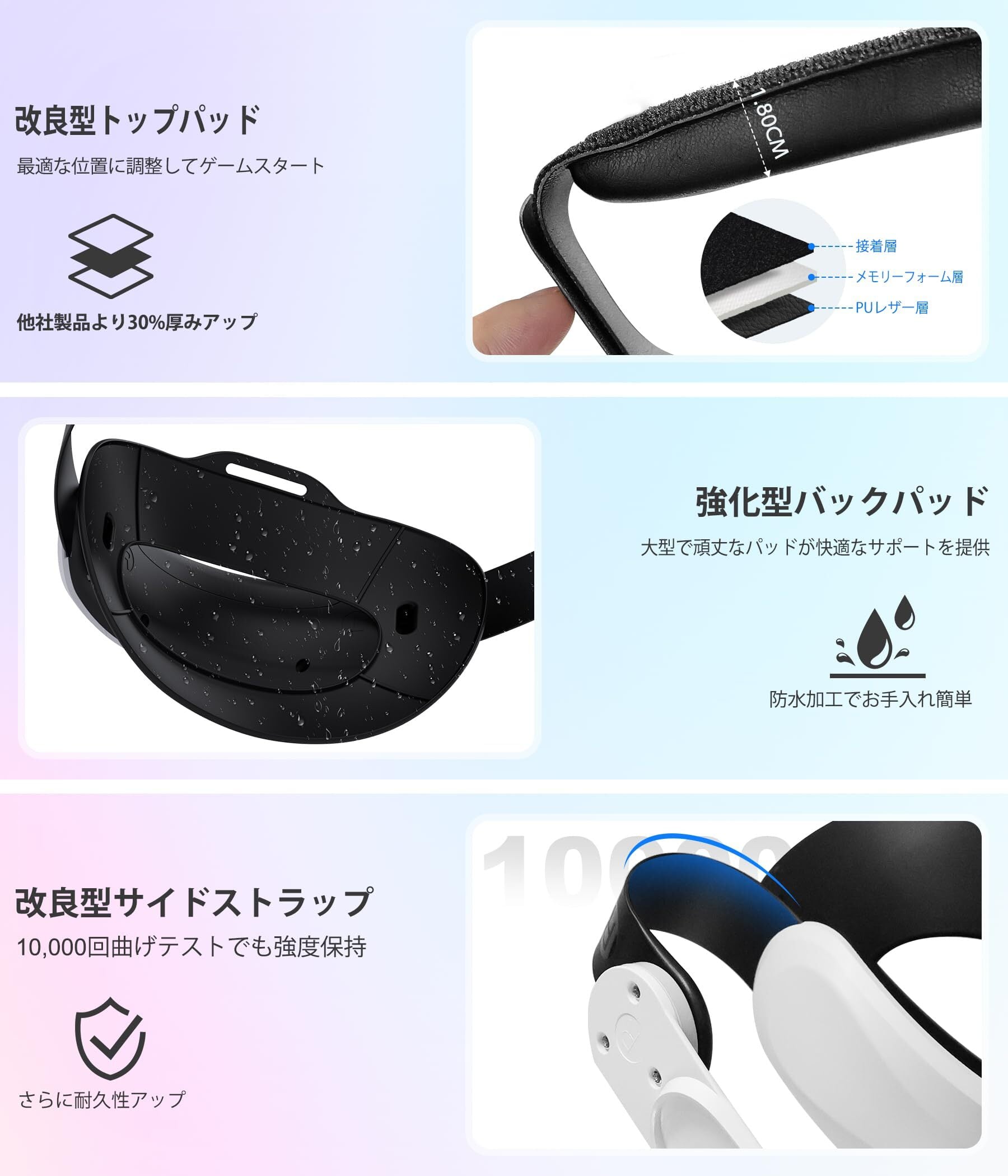 【究極の快適さを追求したデザイン】高密度メモリーフォームを使用したヘッドストラップがヘッドセットの重量を効果的に分散。さらに、高耐久ソフトシリコーン製のリアパッドがさまざまな頭の形に柔軟にフィットします。前後の重量バランスを最適化することで、長時間の使用においても抜群の安定性と快適性を実現します。