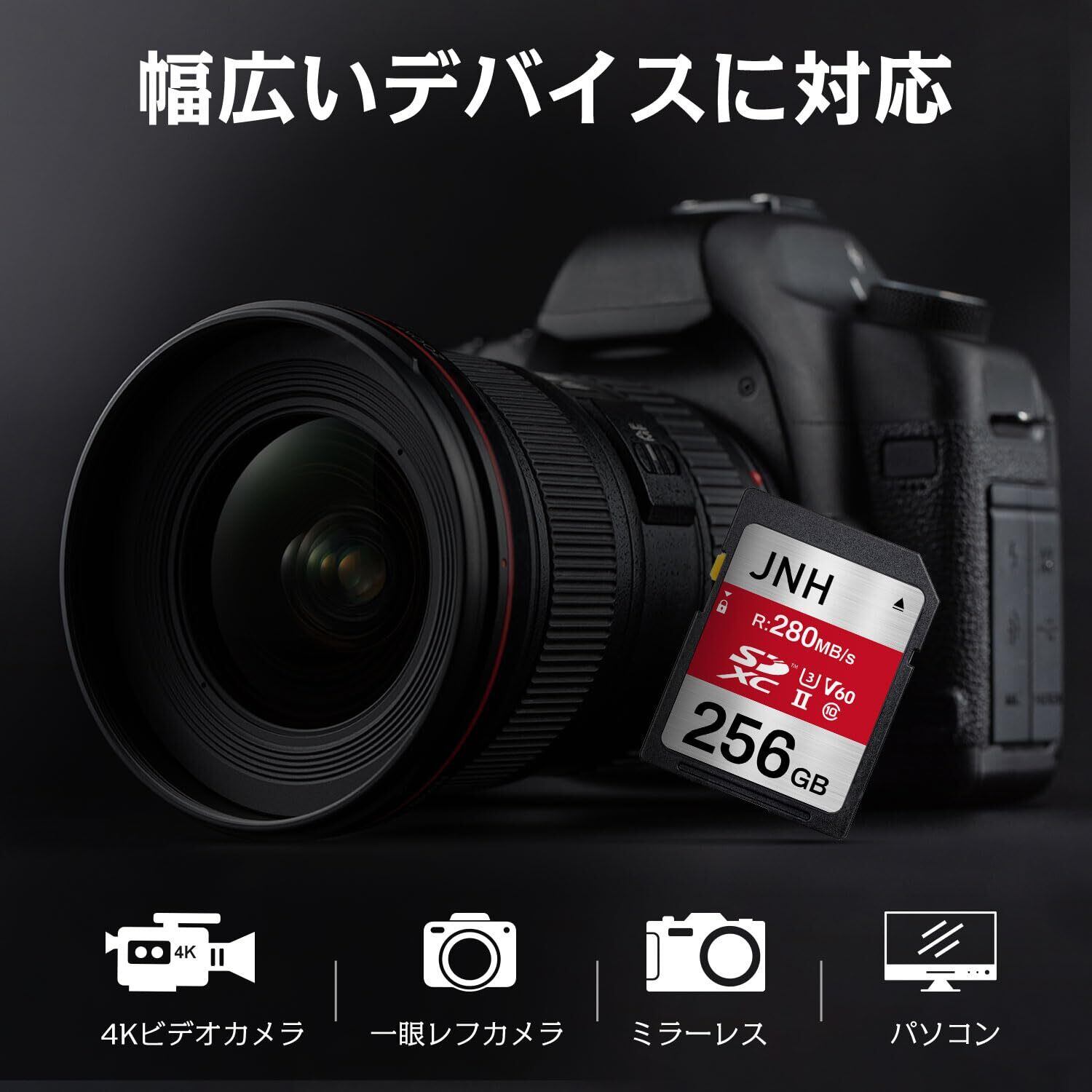 JNH高性能 Extreme Speedシリーズ SDXC UHS-II カード;容量:256GB(ユーザ領域約232GB); 種類:超高速SDXC UHS-II カード ; UHSスピードクラス: U3、SDスピードクラス: C10、Video Speed Class: V60;4K Ultra HD対応;対応フォーマット形式:exFAT。MILカメラやシネマカメラで撮影するプロシューマーやプロフェッショナル向け。ビデオカメラ、一眼レフカメラ、ミラーレスまで様々なタイプのカメラで4K動画の撮影におすすめ。:安心の国内サポートとメーカー5年