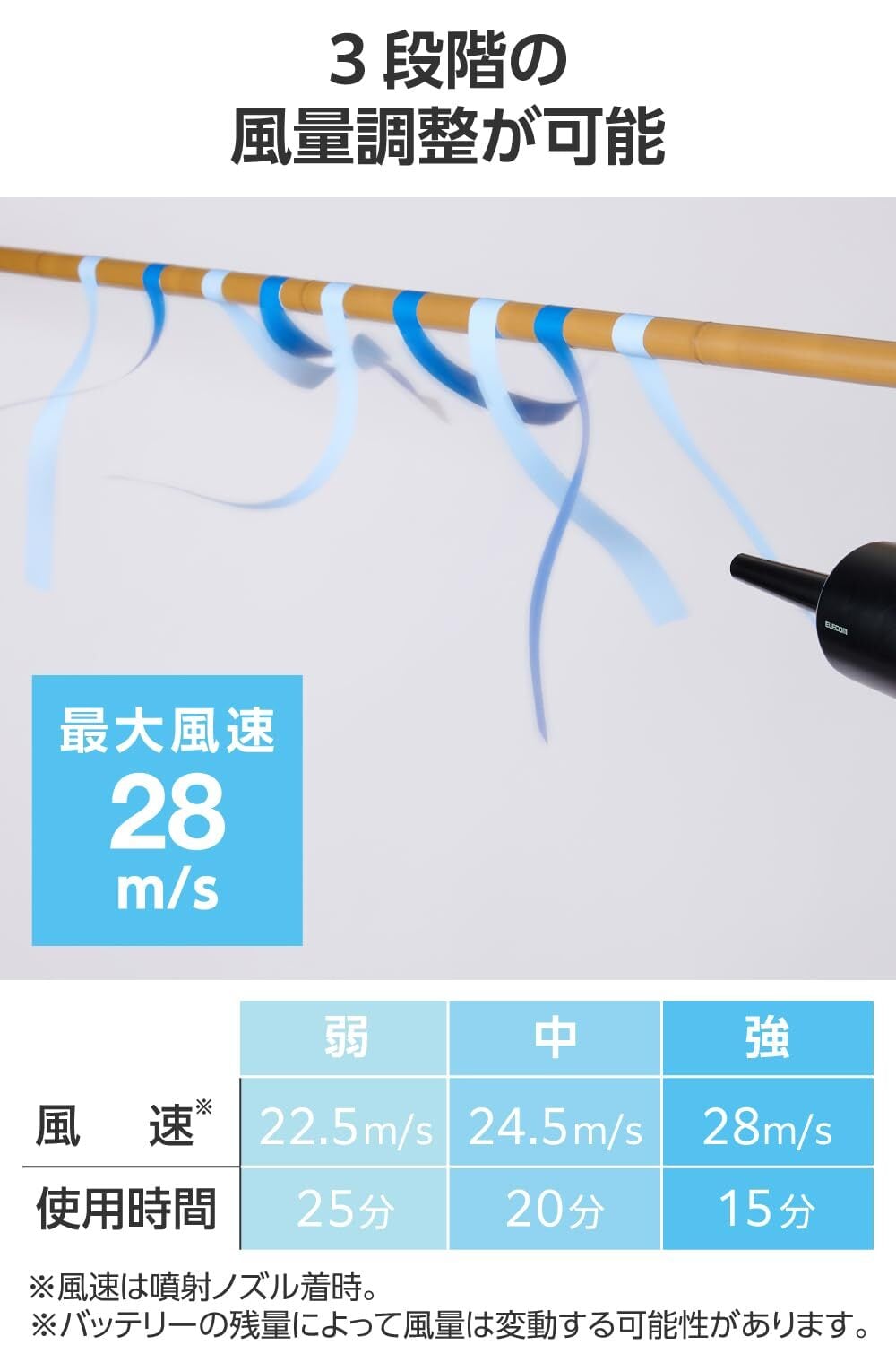■風速:弱モード:約22.5m/s、中モード:約24.5m/s、強モード:約28m/s ※噴射ノズル装着時。 ※バッテリーの残量によって風量は変動する可能性があります。