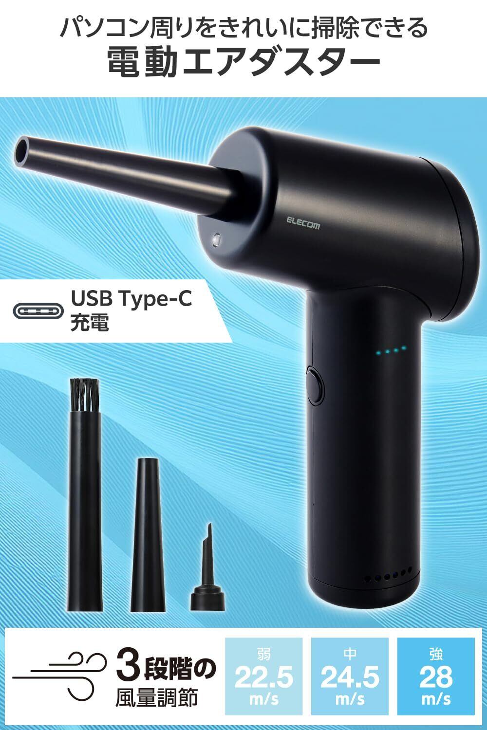 【人気商品】エレコム 電動エアダスター 充電式 強力 逆さ噴射可能 3段階風量調整 49000rpm高速回転 最大風速28m/s LEDライト付き 3種類ノズル付き ADWALBB01BK
