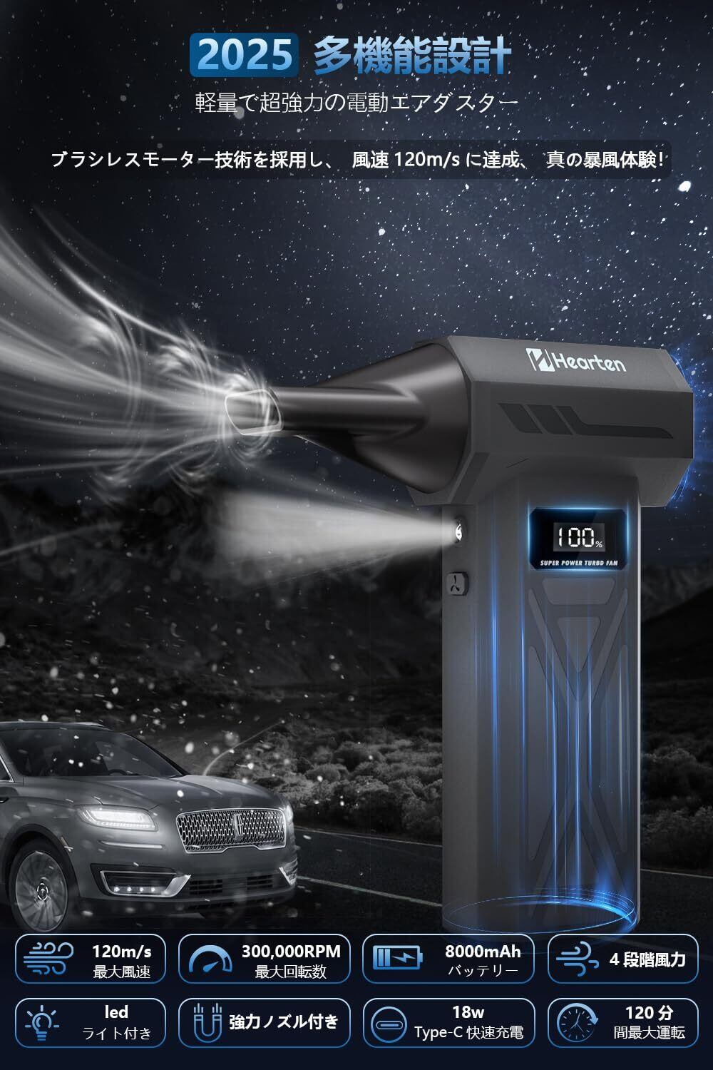Hearten エアダスター【2025暴風体験・最大風速120m/s】ブロワー 300,000RPM 高速回転 エアダスター 強力 4段階風量調整 ブロワー 強力 8000mAh大容量バッテリー LCD電量表示 電動ぶろわー TPYE-C急速充電 LEDライト付き airダスター 電動 小型ぶろわー 210g 軽量 コンパクト 洗車 ぶろわー PC掃除/キーボード/家具/車内/エアコン(ブラック)