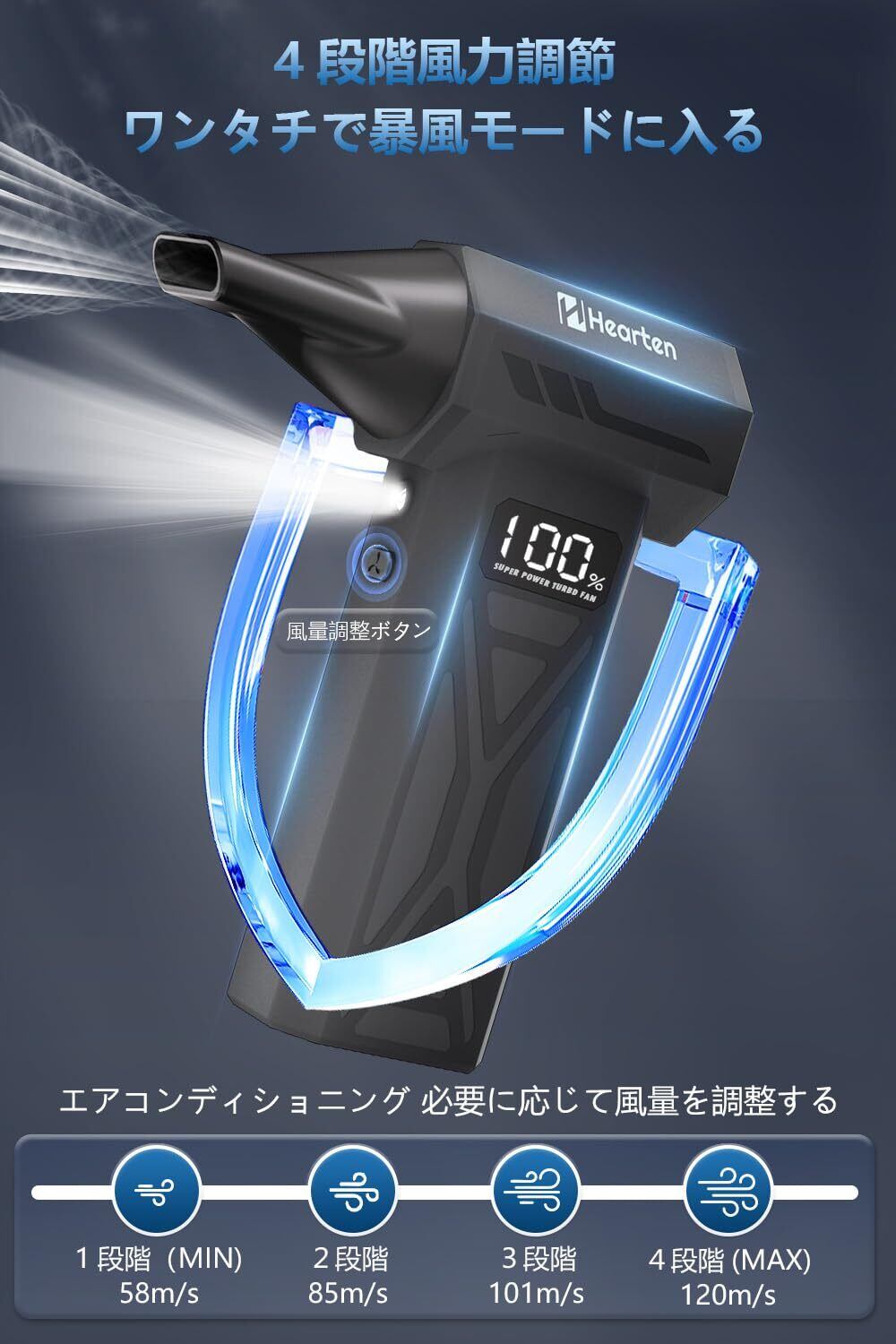 【在庫セール】Hearten エアダスター【2025暴風体験・最大風速120m/s】ブロワー 300,000RPM 高速回転 エアダスター 強力 4段階風量調整 ブロワー 強力 8000mAh大容量バッテリー LCD電量表示 電動ぶろわー TPYE-C急速充電 LEDライト付き airダスター 電動 小型ぶろわー 210g 軽量 コンパクト 洗車 ぶろわー PC掃除/キーボード/家具/車内/エアコン(ブラック) | SmartLiving+