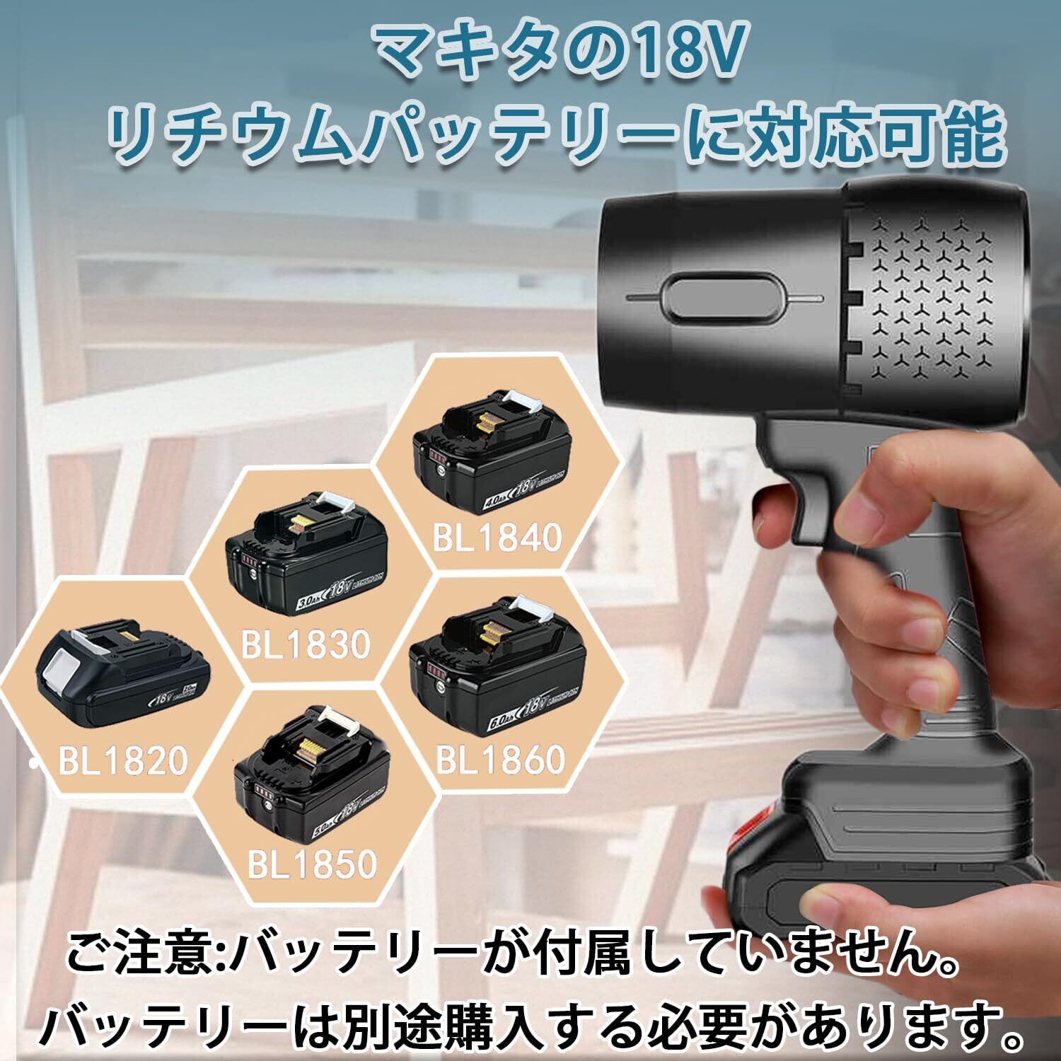 「18Vと互換」マキタ18Vバッテリーと互換できるし、非常に便利です。(※電動エアブロワーのパワーは電池の電力量に関係があります。)ご注意:バッテリーが付属していません。バッテリーは別途購入する必要があります。