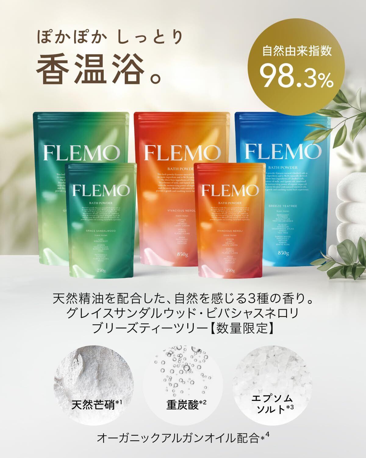 【数量限定】【香温浴】FLEMO(フレモ) 入浴剤 グレイスサンダルウッド(白檀) 約34回分 保湿 バスパウダー 大容量 自然由来成分98.3% 温泉 にごり 保湿 低刺激 芒硝 エプソムソルト 重炭酸 国産 計量スプーン付 850g