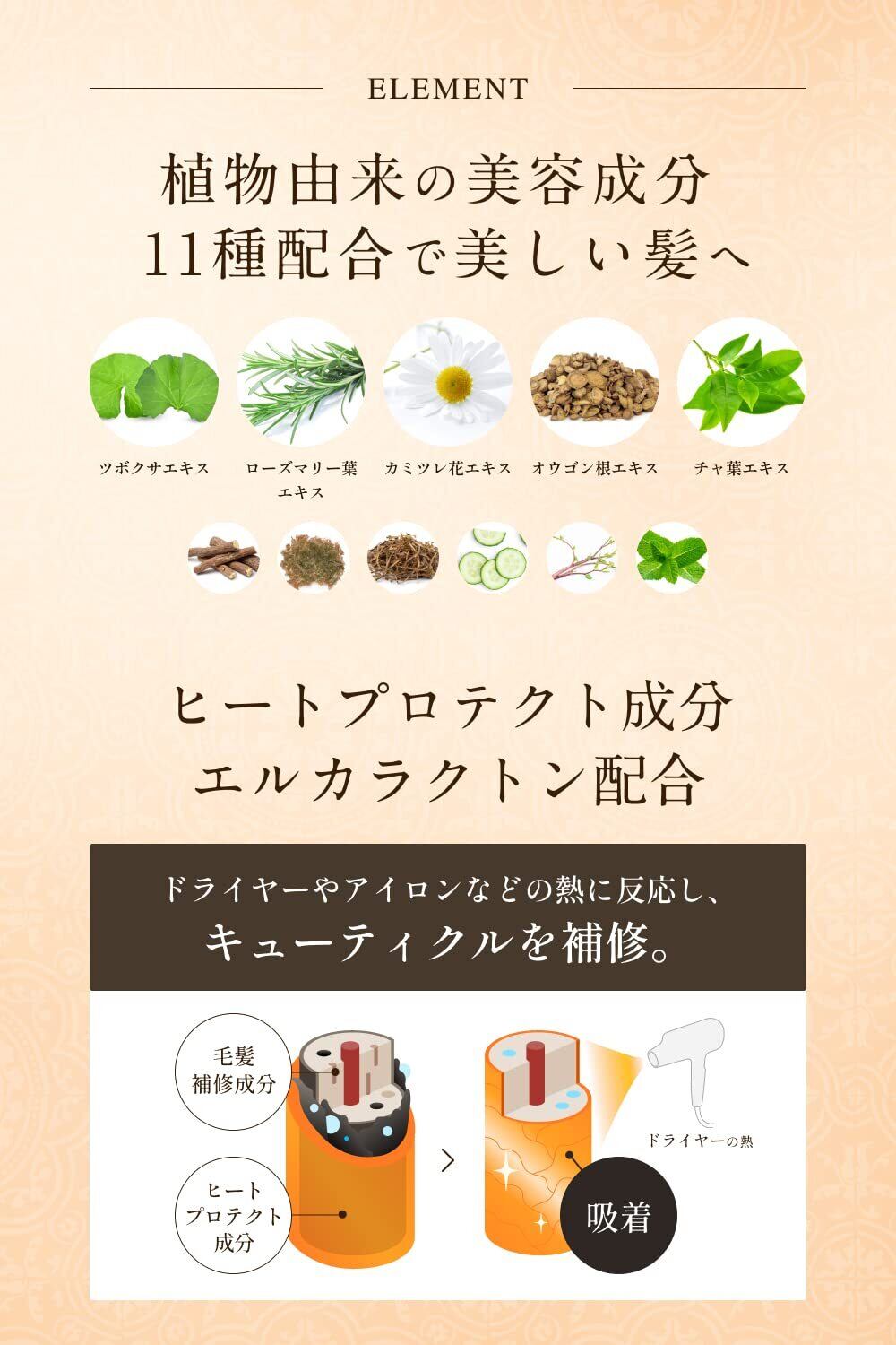 【植物由来のヘアケア成分 エルカラクトン配合】ドライヤーやアイロンなどの熱に反応し、キューティクルを補修。嫌なうねり、絡まりを抑えます。