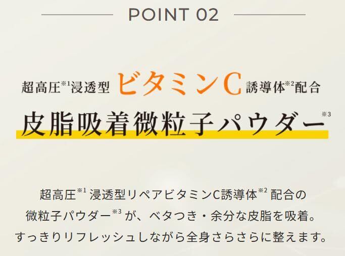 超高圧※1浸透型ビタミンC誘導体*配合皮脂吸着微粒子パウダー※2 ●頭皮臭、汗臭オフ 香りによるマスキング効果で、気になるニオイもオフ。 ●UVカット成分※3 ●アンチポリューション処方