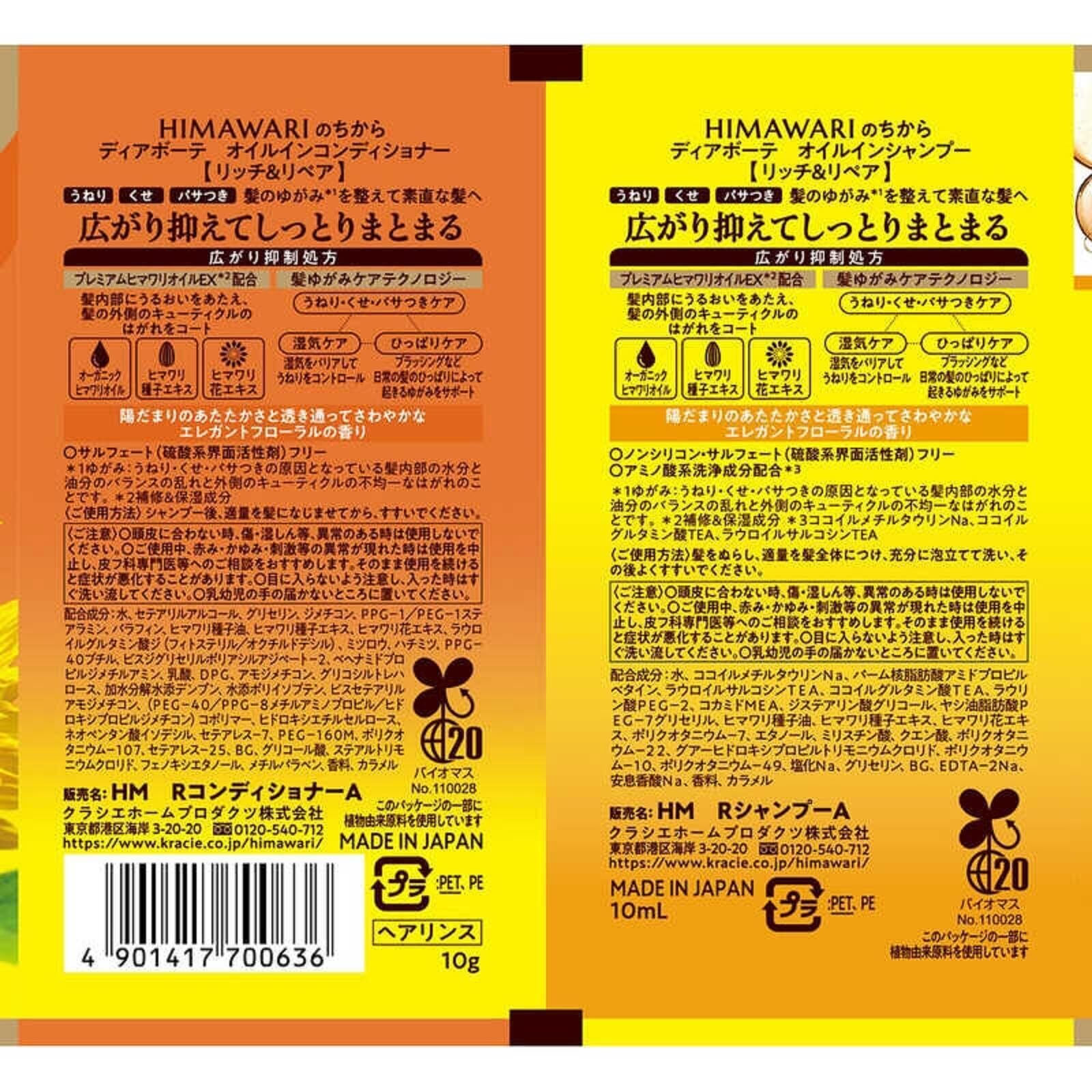 ディアボーテ オイルインシャンプーコンディショナーセット (リッチ&リペア) トラベルセット お試しサシェ5回分(10mL+10g)×5枚 髪のゆがみ(うねり・くせ・パサつき)を整え、素直な髪へと導くノンシリコンヘアケアブランド プレミアムヒマワリオイルEX(オーガニックヒマワリオイル・ヒマワリ芽発酵エキス・ヒマワリ種子エキス・ヒマワリ花エキス)配合脂質&水分キープ+ダメージ補修』 髪表面と髪内部のWからアプローチし、扱いやすい髪へ導く「ゆがみケアシステム」 うねりの目立たない髪へと導く「うねりコントロール処方」 傷んだ部分をねらって集中補修するダメージセンサー機能 サルフェートフリー処方 リッチ&リペア:陽だまりのあたたかさと透明感のある心地良いエレガントフローラルの香り リニューアル等により、商品パッケージが変わることがあります 原材料・成分 【シャンプー】水、ココイルメチルタウリンNa、パーム核脂肪酸アミドプロピルベタイン、ラウロイルサルコシンTEA、ココイルグルタミン酸TEA、ラウリン酸PEG-2、コカミドMEA、ジステアリン酸グリコール、ヤシ油脂肪酸PEG-7グリセリル、ヒマワリ種子油、ヒマワリ種子エキス、ヒマワリ花エキス、ポリクオタニウム-7、エタノール、ミリスチン酸、クエン酸、ポリクオタニウム-22、グアーヒドロキシプロピルトリモニウムクロリド、ポリクオタニウム-10、ポリクオタニウム-49、塩化Na、グリセリン、BG、EDTA-2Na、安息香酸Na、香料、カラメル 【コンディショナー】水、セテアリルアルコール、グリセリン、ジメチコン、PPG-1/PEG-1ステアラミン、パラフィン、ヒマワリ種子油、ヒマワリ種子エキス、ヒマワリ花エキス、ラウロイルグルタミン酸ジ(フィトステリル/オクチルドデシル)、ミツロウ、ハチミツ、PPG-40ブチル、ビスジグリセリルポリアシルアジペート-2、ベヘナミドプロピルジメチルアミン、乳酸、DPG、アモジメチコン、グリコシルトレハロース、加水分解水添デンプン、水添ポリイソブテン、ビスセテアリルアモジメチコン、(PEG-40/PPG-8メチルアミノプロピル/ヒドロキシプロピルジメチコン)コポリマー、ヒドロキシエチルセルロース、ネオペンタン酸イソデシル、セテアレス-7、PEG-160M、ポリクオタニウム-107、セテアレス-25、BG、グリコール酸、ステアルトリモニウムクロリド、フェノキシエタノール、メチルパラベン、香料、カラメル