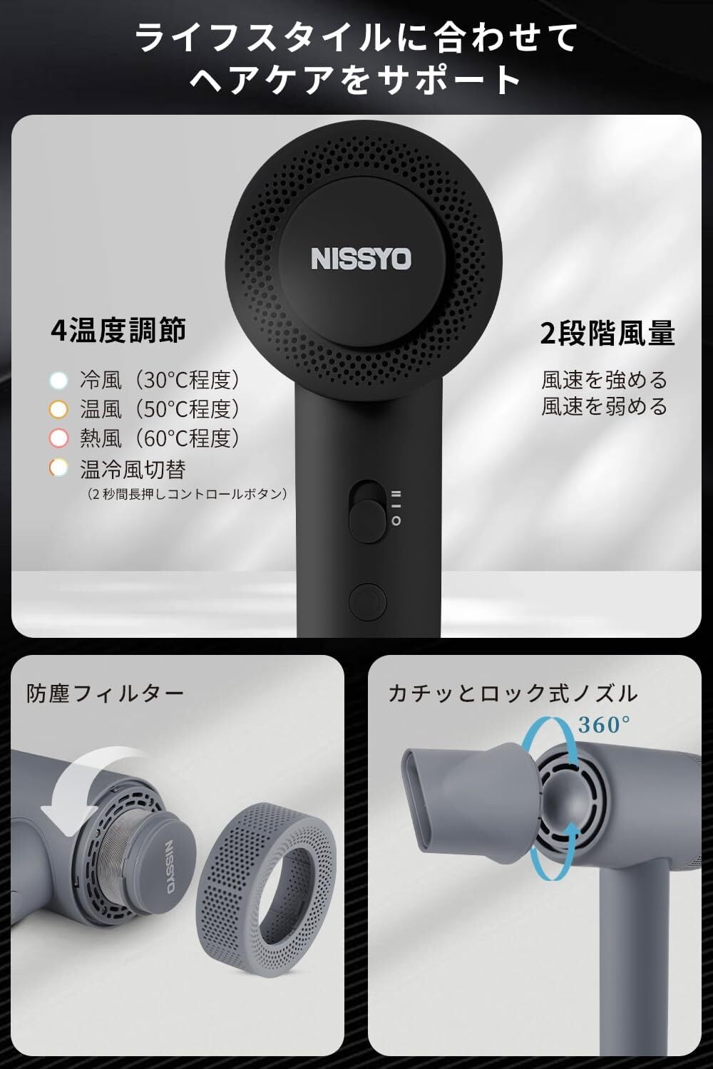 NISSYO【日本正規品・2025最新型ドライヤー】速乾 ヘアードライヤー 大風量 2億マイナスイオン 低温 NTC 温調機能 温冷リズム 冷風 軽量 高速ドライヤー ヘアケア 美髪 6モード 自動クリーニングモード 静電気 1200W ノズル付き コンパクト 家庭用 ギフト プレゼント PSE認証済み グレー