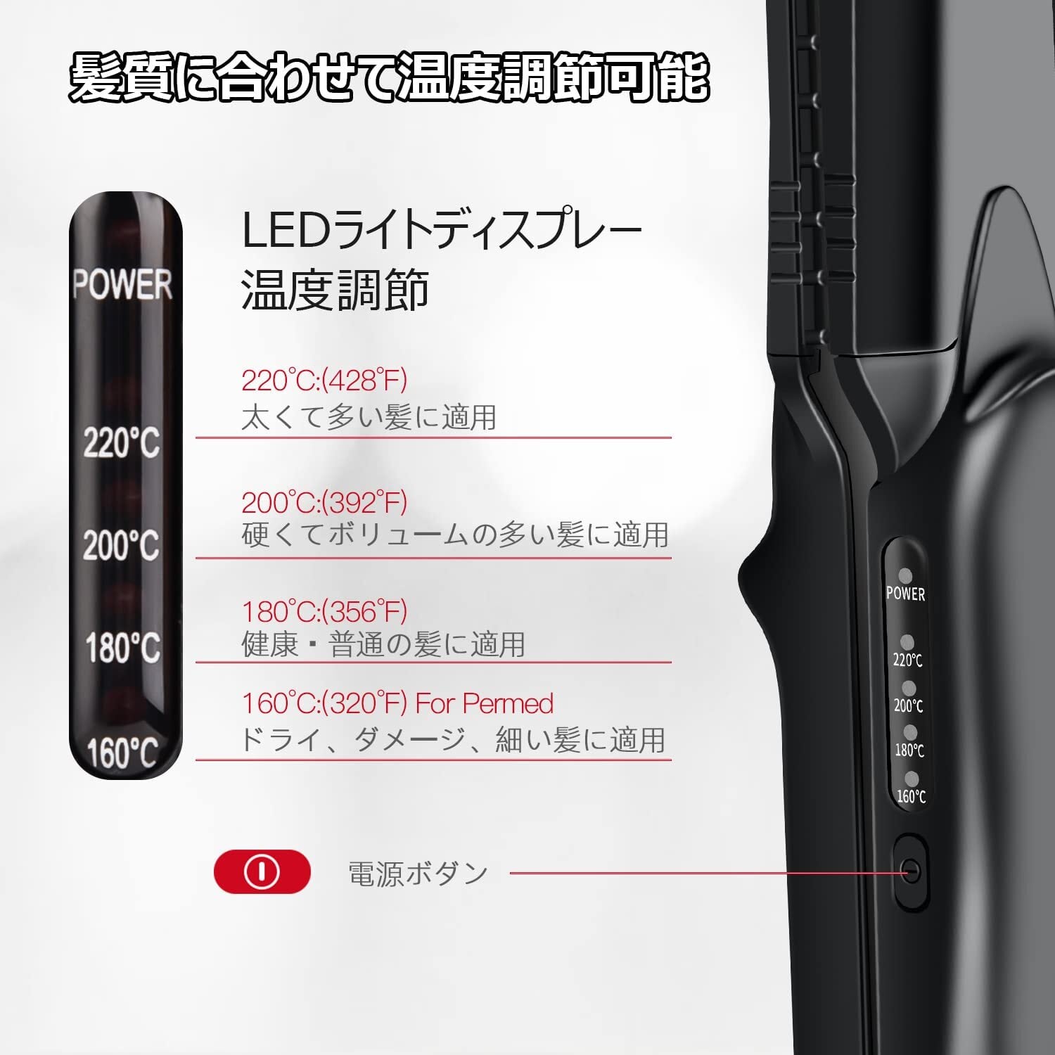 【4段階温度&30秒急速加熱】160℃、180℃、200℃、220℃4段階温度調節可能、軟毛・細毛・ダメージ毛・硬毛・太毛など、ご自身の髪に合った温度を合わせてご使用頂けます。PTCヒート技術で、わずか30秒均一に加熱されます。