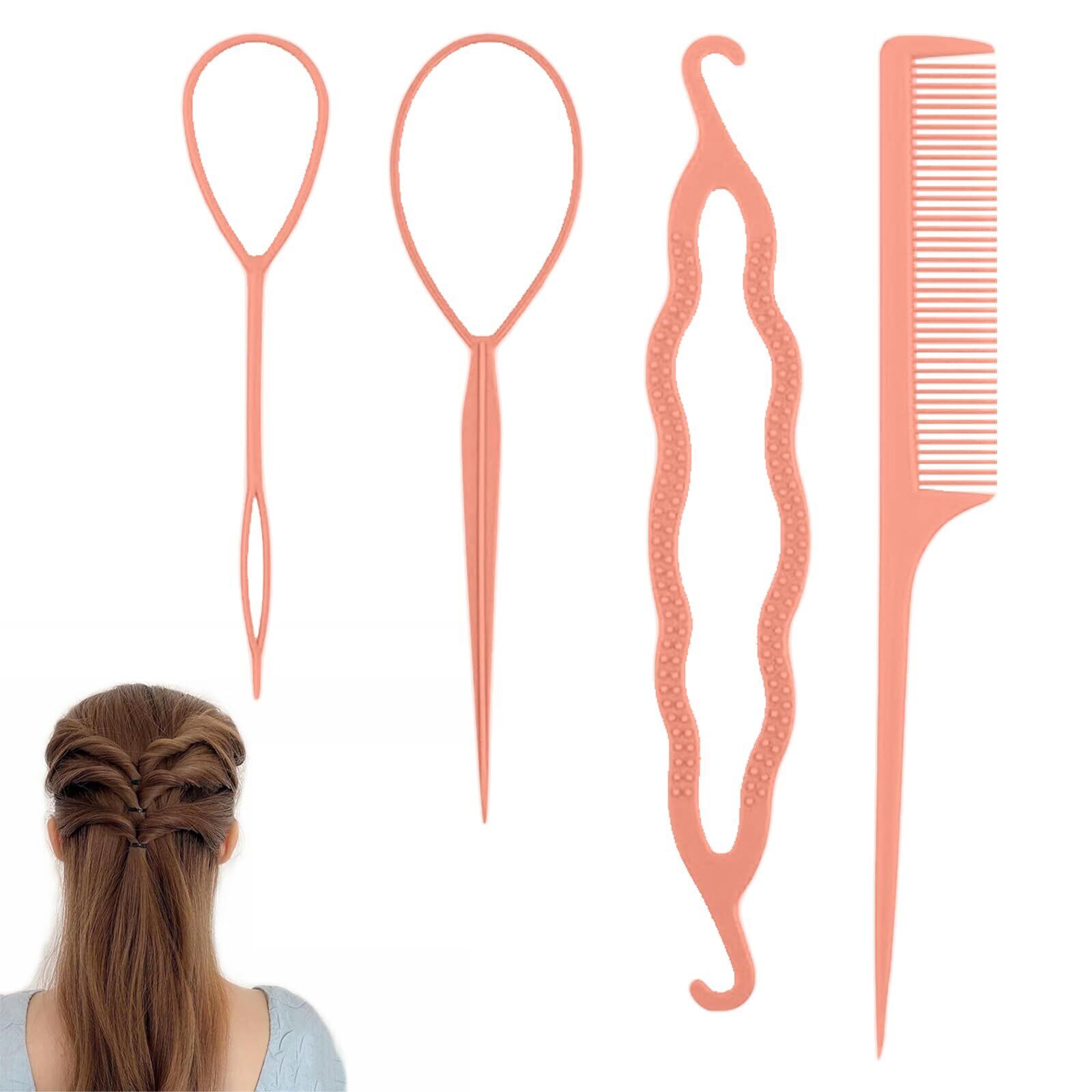 BLOOPIC ヘアアレンジスティック くるりんぱ スティック (4本セット) ヘアブレイディングキット まとめ髪スティック ヘアスタイリングツール 簡単ヘアアレンジ ィック ヘアコーム お団子ヘア 女性のヘアスタイリングツール (フレッシュピンク)