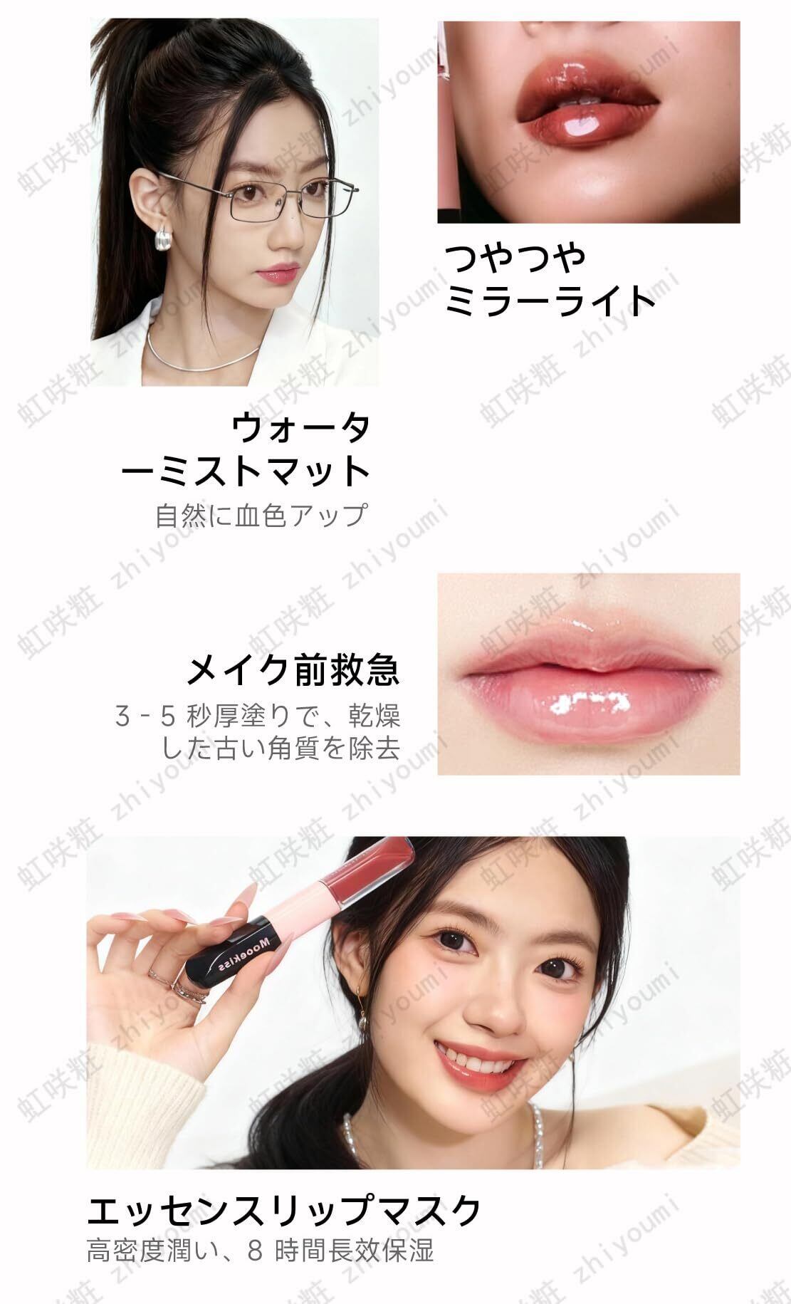 【ダブルヘッド設計で 】2in1リップ ,マット唇泥と鏡面水光唇蜜の 2 種風格を堪能。マット側でしっかりカバーし血色アップ、透明エッセンス側重ね塗りで瞬時に水光鏡面感演出。軽い水感・透き通ったふっくらさで唇潤し ,長時間美しさ維持。