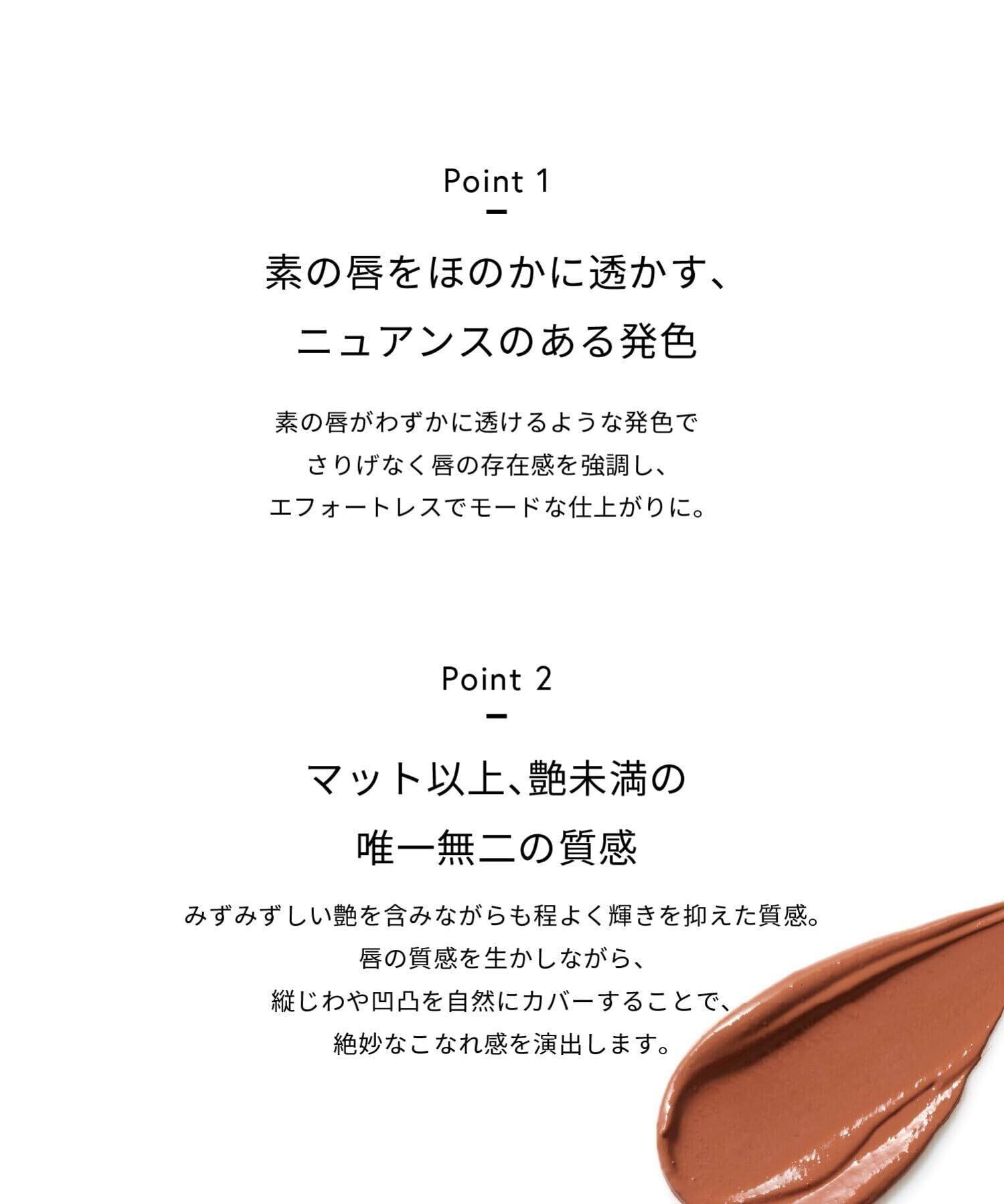 ■【軽やかなニュアンス発色!】こちらの口紅は、透け感のある軽やかな発色が特徴。自分の唇の色味を活かしつつ、自然な仕上がりを実現します。心地よい塗り心地で、魅力的な唇を演出します。