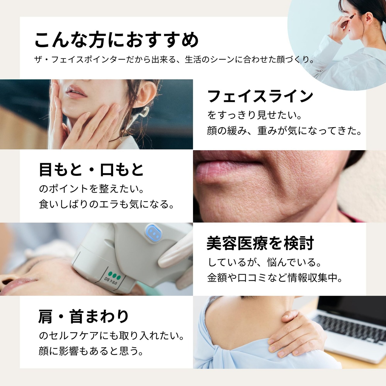 【使える部位は顔周り全般】ほうれい線、頬まわり、目元、口元、フェイスライン、あご下、頭部(こめかみ・側頭部・後頭部)、耳下腺に使用できます。※避ける部位:眼球、粘膜、傷口やのどぼとけ周辺。耳や鼻付近は穴に入らないよう、もう片方の手でサポートしてください。