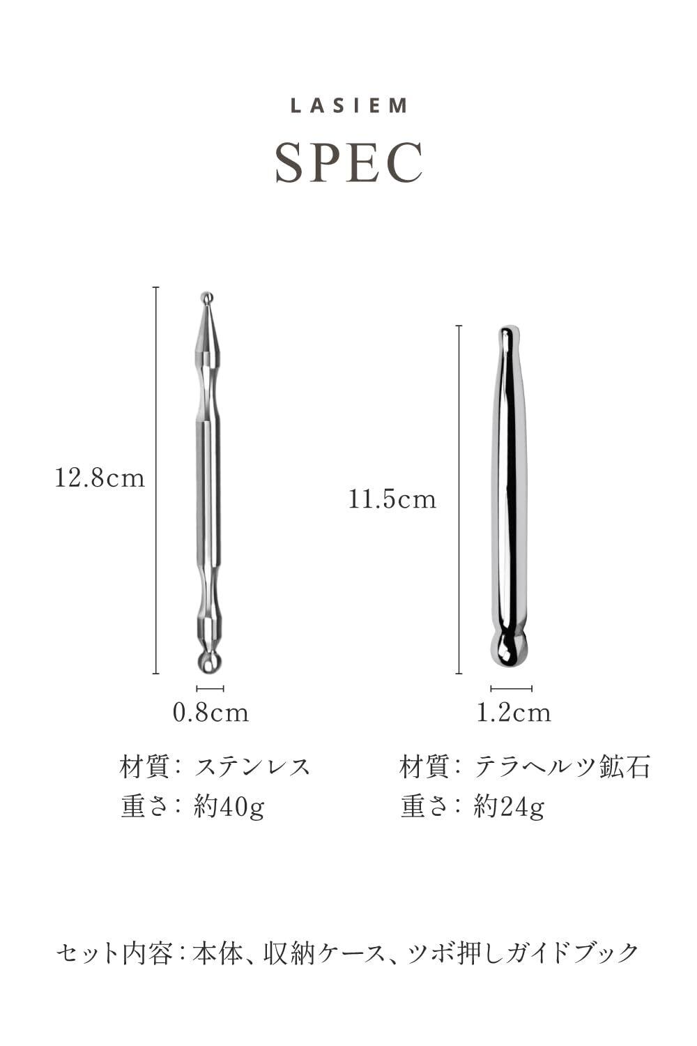 【ステンレス製】[本体]縦:約12.8cm 横:約1cm[重量]約40g[素材]ステンレス 【テラヘルツ製】[本体]縦:約11.5cm 横:約1.2cm[重量]約24g[素材]テラヘルツ鉱石 【同梱物】本体/収納ケース/ツボ押しガイドブック