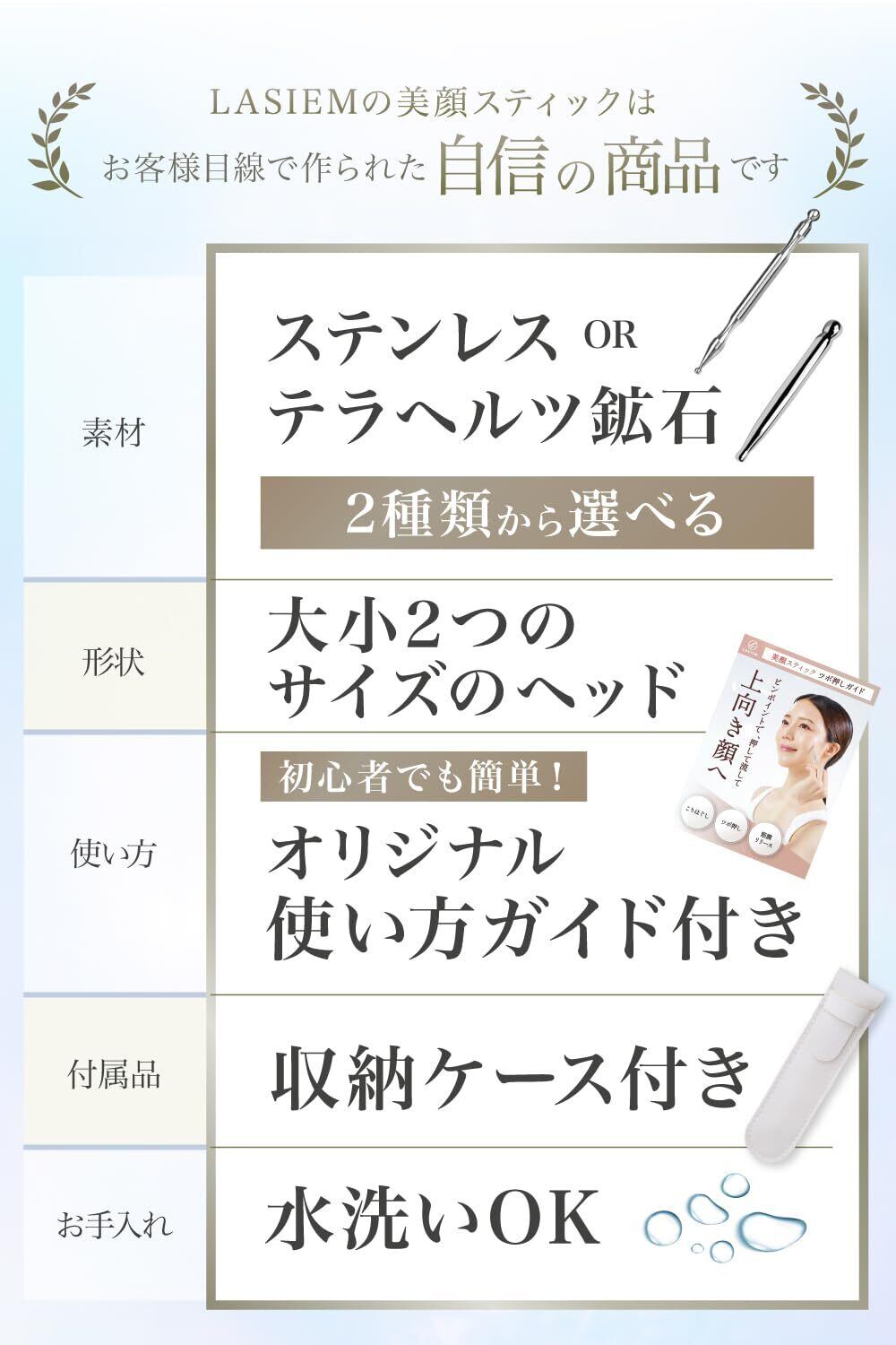 【選べる2タイプ】「ステンレス製」Point1:くぼみがあって滑らず持ちやすい Point2:2つのサイズのヘッド小さい方はピンポイントアプローチに、大きい方は首筋などの大きな部分や肩周りの筋肉ほぐしにも使える Point3:錆びにくく、耐熱性・耐低温性に優れた、ステンレス素材を採用。水洗いも可能で衛生的に長期間使用可能!「テラヘルツ製」Point1:程よい太さで持ちやすい Point2:2つのサイズのヘッド 小さい方はピンポイントアプローチに、大きい方は首筋などの大きな部分や肩周りの筋肉ほぐしにも使える Point3:熱伝導性に優れたテラヘルツ素材を採用。手の温度が伝わりやすいので温めながらマッサージが可能。水洗いもOK※鉱石のため、落下等の衝撃が加わると割れてしまう場合がございます。お取り扱いにはご注意をお願いいたします。