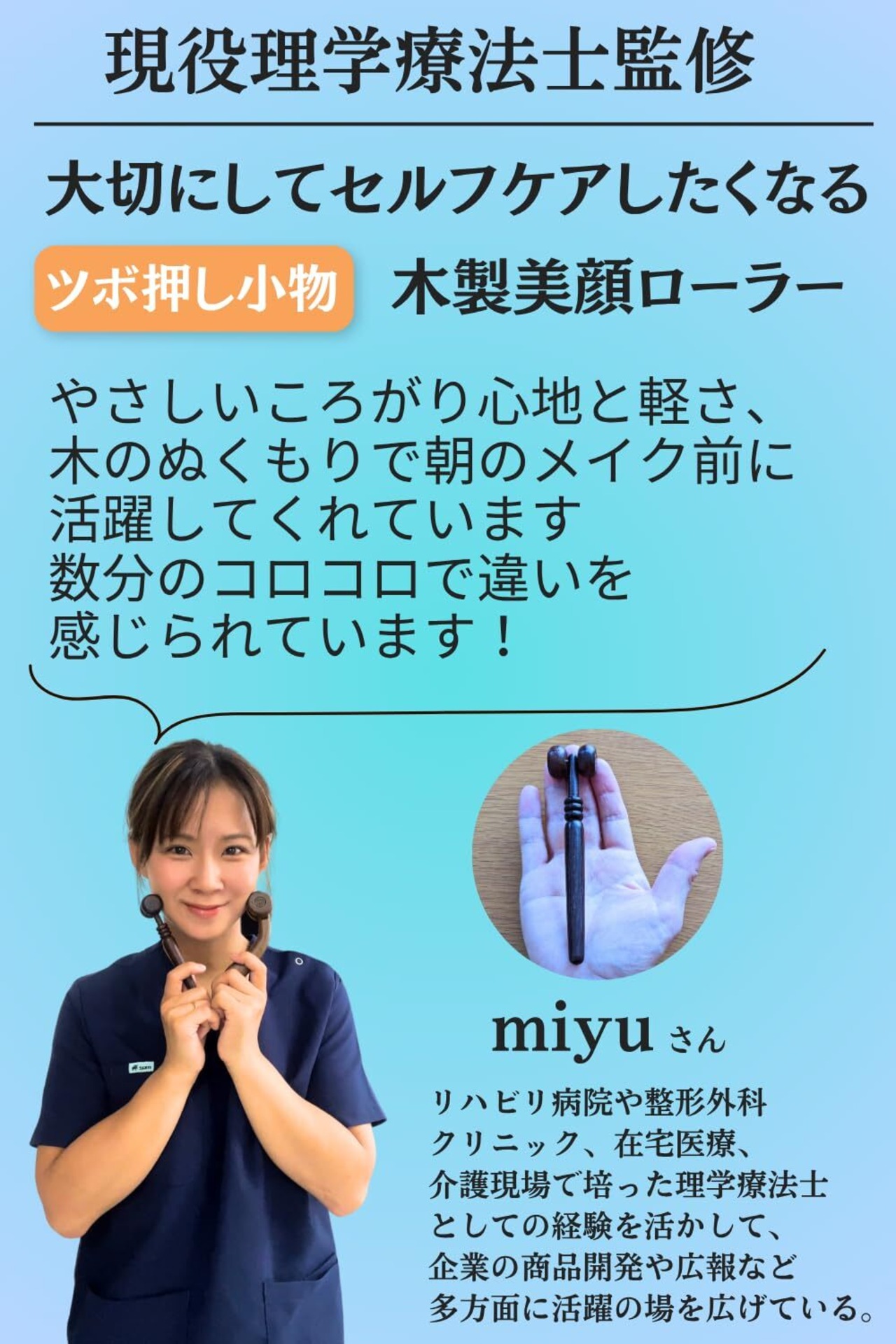 天然木で顔をコロコロして表情筋をほぐしたり、顔のツボを押すのに役に立ちます。目の下のたるみや小顔、目元ケア、リフトアップ、手や足ツボ押しにオススメ。