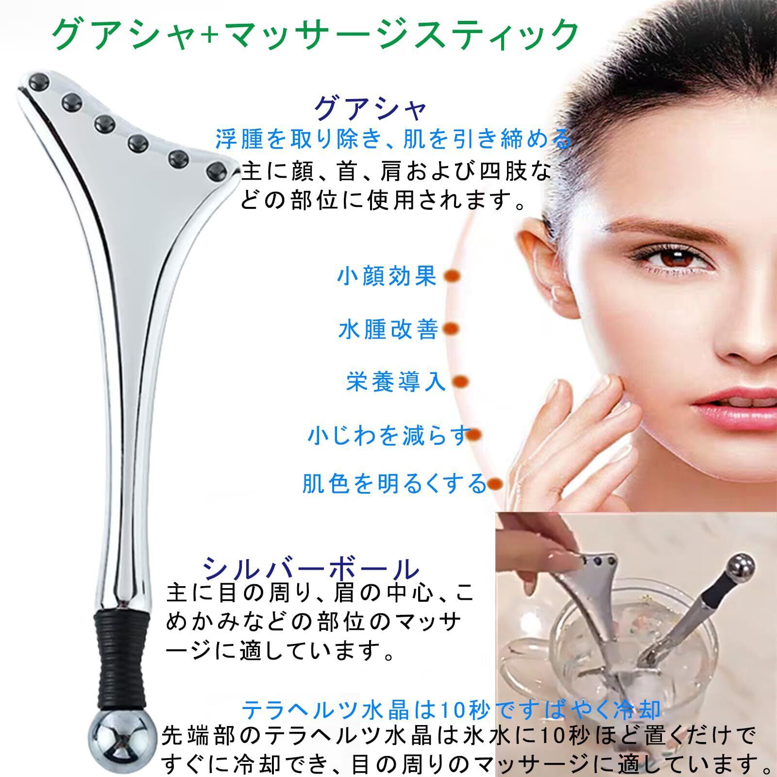 【テラヘルツ水晶は10秒ですばやく冷却】先端部のテラヘルツ水晶は氷水に10秒ほど置くだけですぐに冷却でき、目の周りのマッサージに適しています。尾部グアシャは主に顔、首、肩から全身までのグアシャに使用可能です。