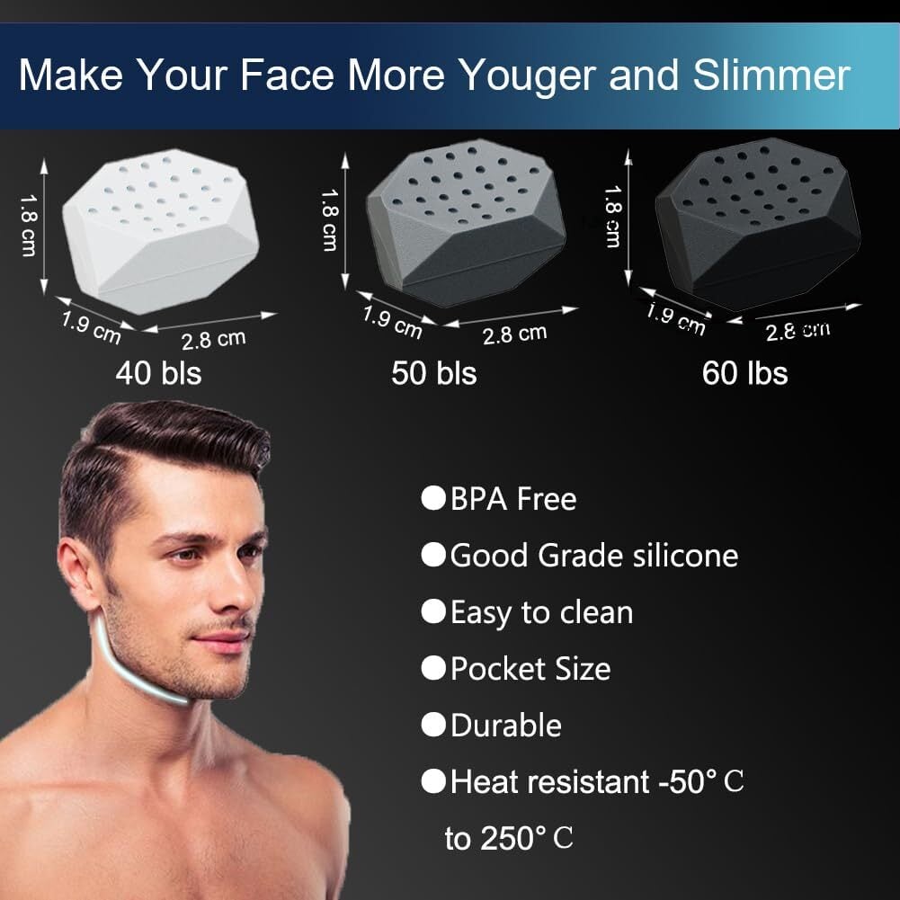 3つの抵抗レベル(3セット):初心者、中級者、上級者向けの食品グレードのシリコンタブレット3組(40ポンド、50ポンド、60ポンドの抵抗)。 明確な顎のラインを実現するには、毎日10分間噛む顎トレーナーが必要です。